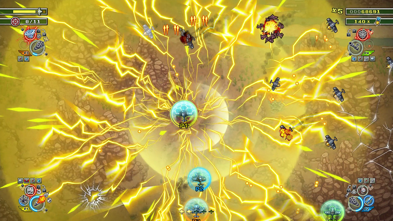 A játék huszonöt pályán keresztül dobálja elénk az ellenfeleket, egyedül vagy akár négyfős kooperatív módban. Ha szólóban játszom, a század akkor is velem van: kötelékben repülnek, plusz tűzerőt adnak, és közben hozzák a saját nyűgjeiket is. Multiplayerben kicsit szigorúbb a kihívás, de cserébe nagyobb a pontszórás lehetősége, és végre értelme van a képernyő különböző részeit lefedni.