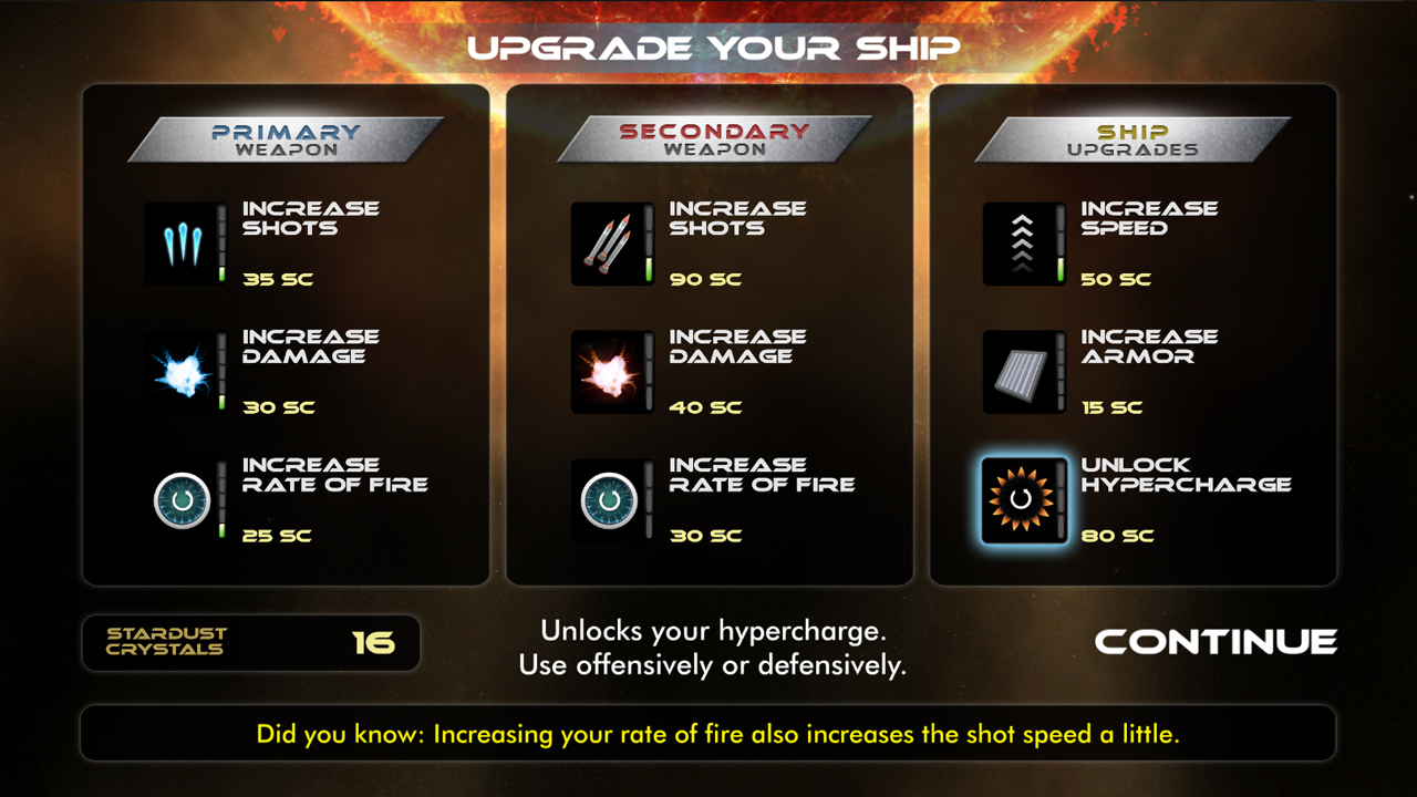A játék tempója nem túl nehéz, bár eleinte úgy tűnhet, hogy a fejlődés eléggé lassú. De miután elkezded fejleszteni a hajódat, a dolgok már izgalmasabbá válnak. A fegyverek és a sebesség növelése valódi motivációt ad. Az upgrade rendszertől szinte függsz, mivel sosem tudhatod, hogy a következő körben mi fog jönni.