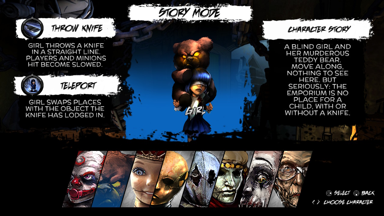 A karakterek között találunk mindenféle különleges figura, a rémisztő bohóctól kezdve a törött tesztbábuig, de ahelyett, hogy mindegyik igazi egyéniséggé vált volna, inkább egy-két szórakoztató mozdulattal próbálnak kitűnni a tömegből. Sajnos a legtöbbjük olyan, mintha egy-egy paródia szereplője lenne, és a harcok közepette inkább csak idegesítenek, mintsem segítenek.