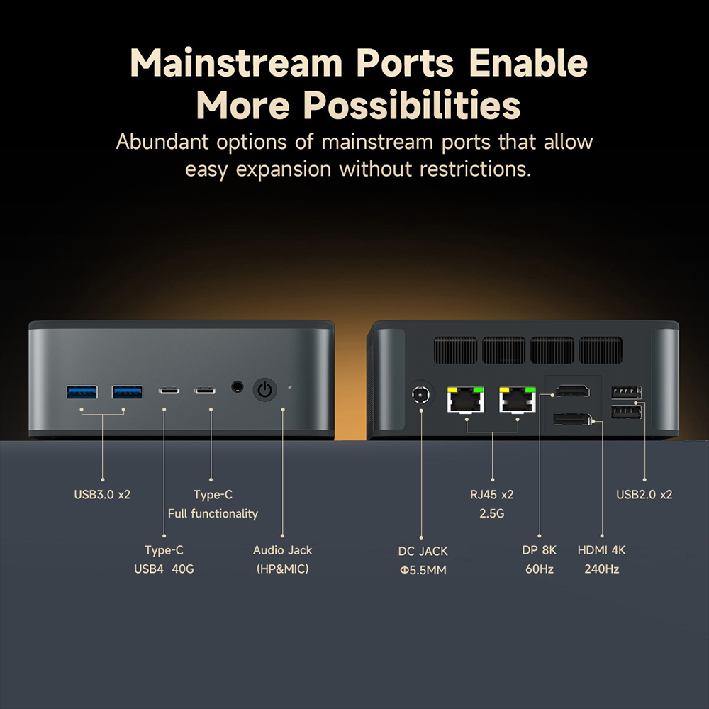 A dupla 2.5G LAN port az a feature, amit nem sok mini PC tud ilyen szinten. Ez már szerveres, hálózatos játék.