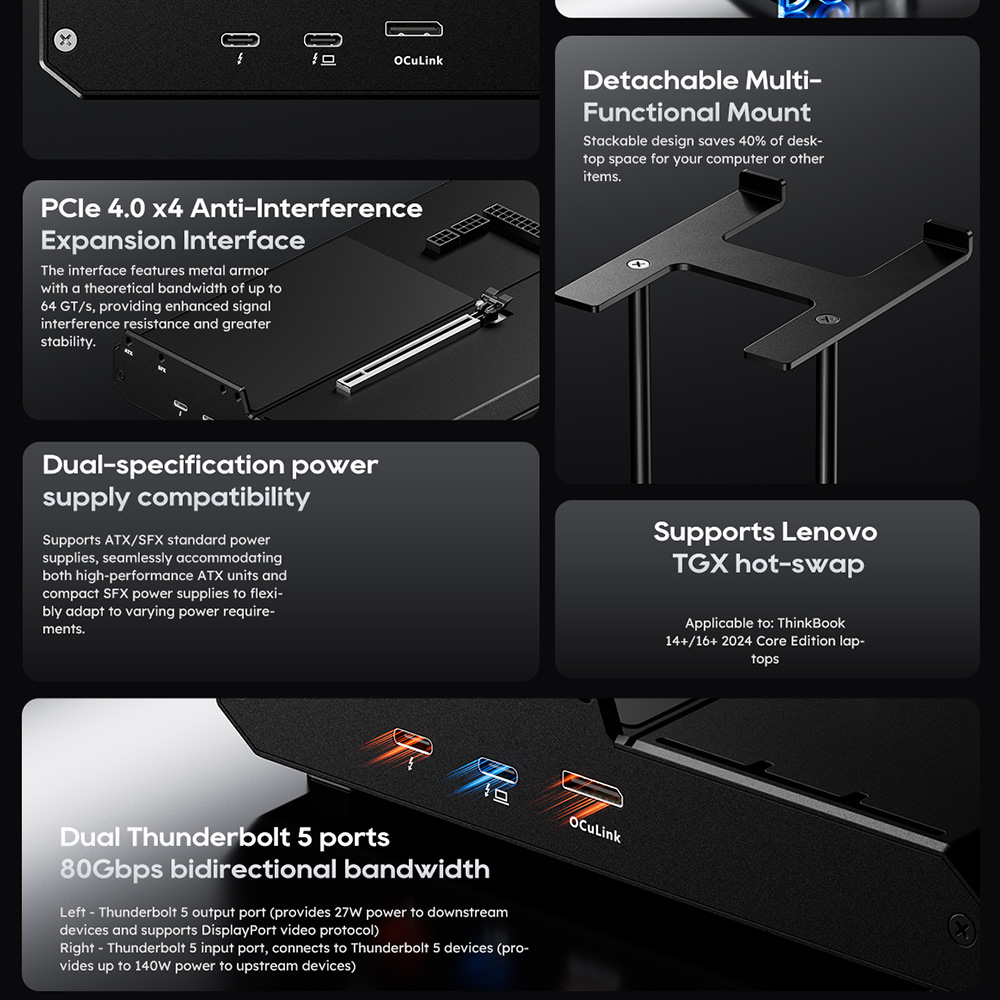 - : Az EG02 legerősebb oldala az, hogy az OCuLink PCIe 4.0 x4 és a kettős Thunderbolt 5 kombinációjával végre nem kell egyetlen kompromisszumos kapcsolati útra feltétlenül rábízni az egész setupot. Az ATX/SFX tápegység-kompatibilitás, a reteszelhető OCuLink, a mini PC-t tápláló DC-csatlakozás, a TGX hot-swap támogatás bizonyos Lenovo modellekkel, valamint a rakásolható kialakítás együtt azt az érzést adják, hogy nem csak gyors, hanem átgondolt dokkolóról van szó. A friss hardveres reakciók alapján különösen sokan értékelik azt, hogy az EG02 nem zárt, nem proprietary és nem akar fölösleges korlátokat erőltetni a felhasználóra.