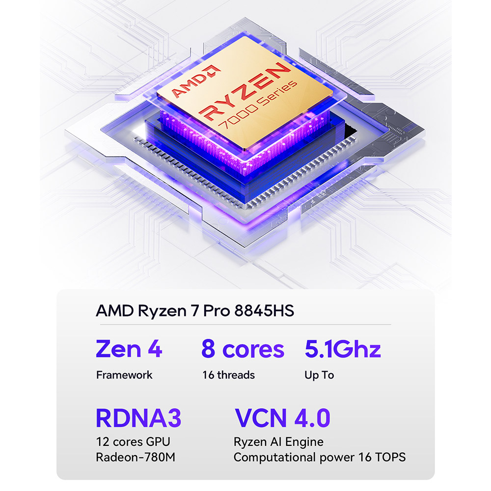 A motorháztető alatt ugyanaz a Ryzen 7 Pro 8845HS dolgozik, amit már láttam más mini PC-kben – és továbbra is az a kategória, ahol az ember csak bólint egyet, hogy „igen, ez már rendben van”.