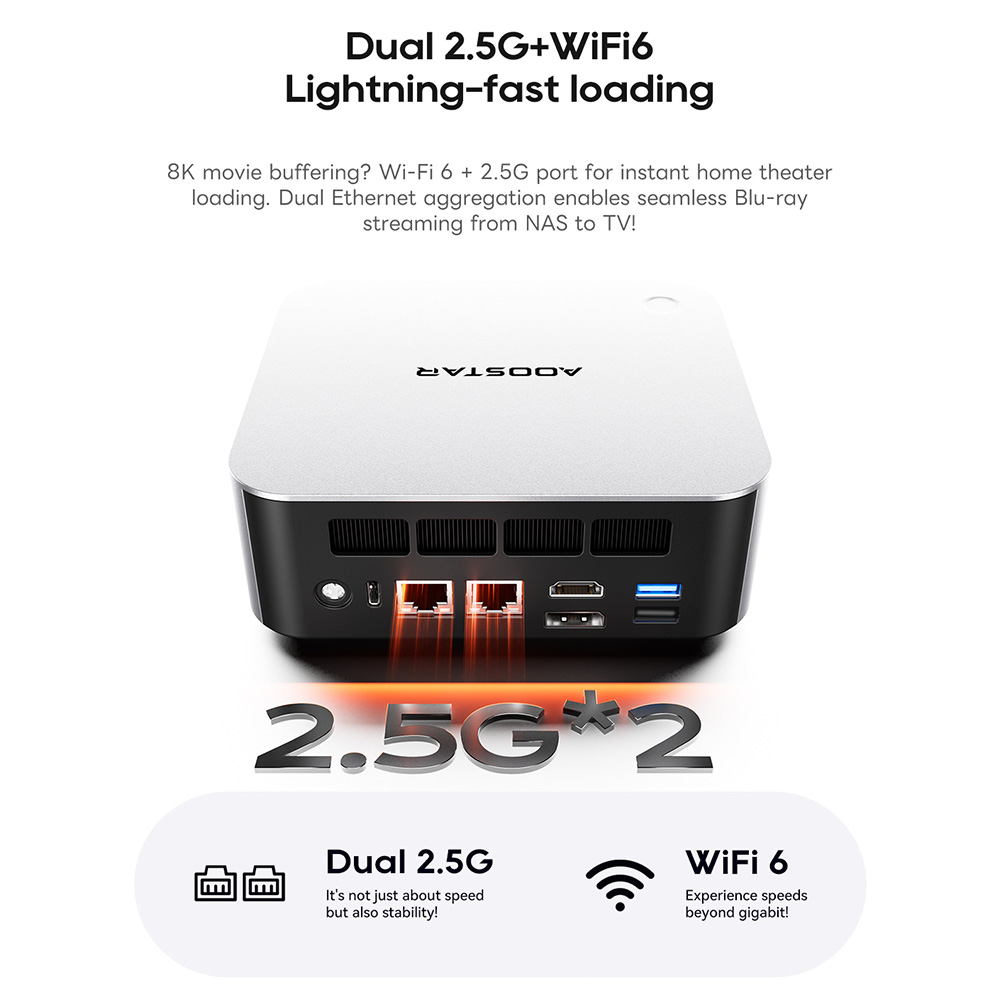 A középpontban az AMD Ryzen 7 H255 áll, 8 maggal, 16 szállal, akár 4,9 GHz-es turbóval, mellette az AMD Radeon 780M integrált grafika, két USB4, OCuLink, dupla 2.5G LAN, WiFi 6, és egy olyan portkiosztás, amitől az embernek az az érzése támad, hogy ezt a gépet nem marketingosztály, hanem tényleg használó emberek rakták össze.