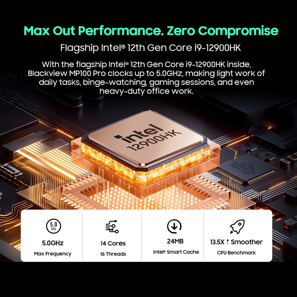 A Blackview MP100 Pro eddig is egy erős mini PC volt, de az i9-12900HK-s verzió már egy teljesen más liga. Itt már nem arról beszélünk, hogy „kis helyen elfér”, hanem arról, hogy mit tudsz belepakolni teljesítményben egy ilyen méretbe.