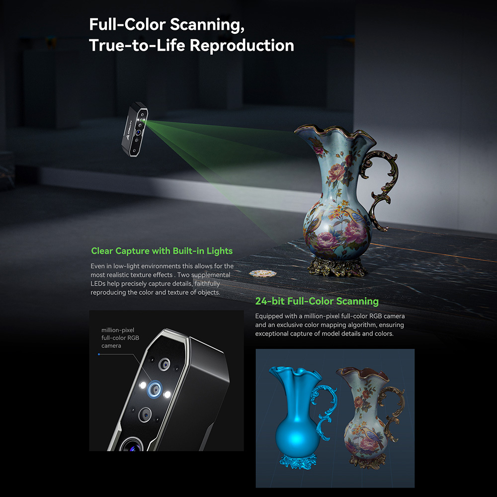 Ezt segíti a két fehér LED-es kiegészítő világítás is, ami gyengébb fényviszonyok között próbálja meg stabilabban és élethűbben visszaadni a felületeket. Ez különösen ott jöhet jól, ahol a modell nem pusztán nyomtatási alapanyag, hanem vizuális referencia vagy prezentálható digitális objektum is.