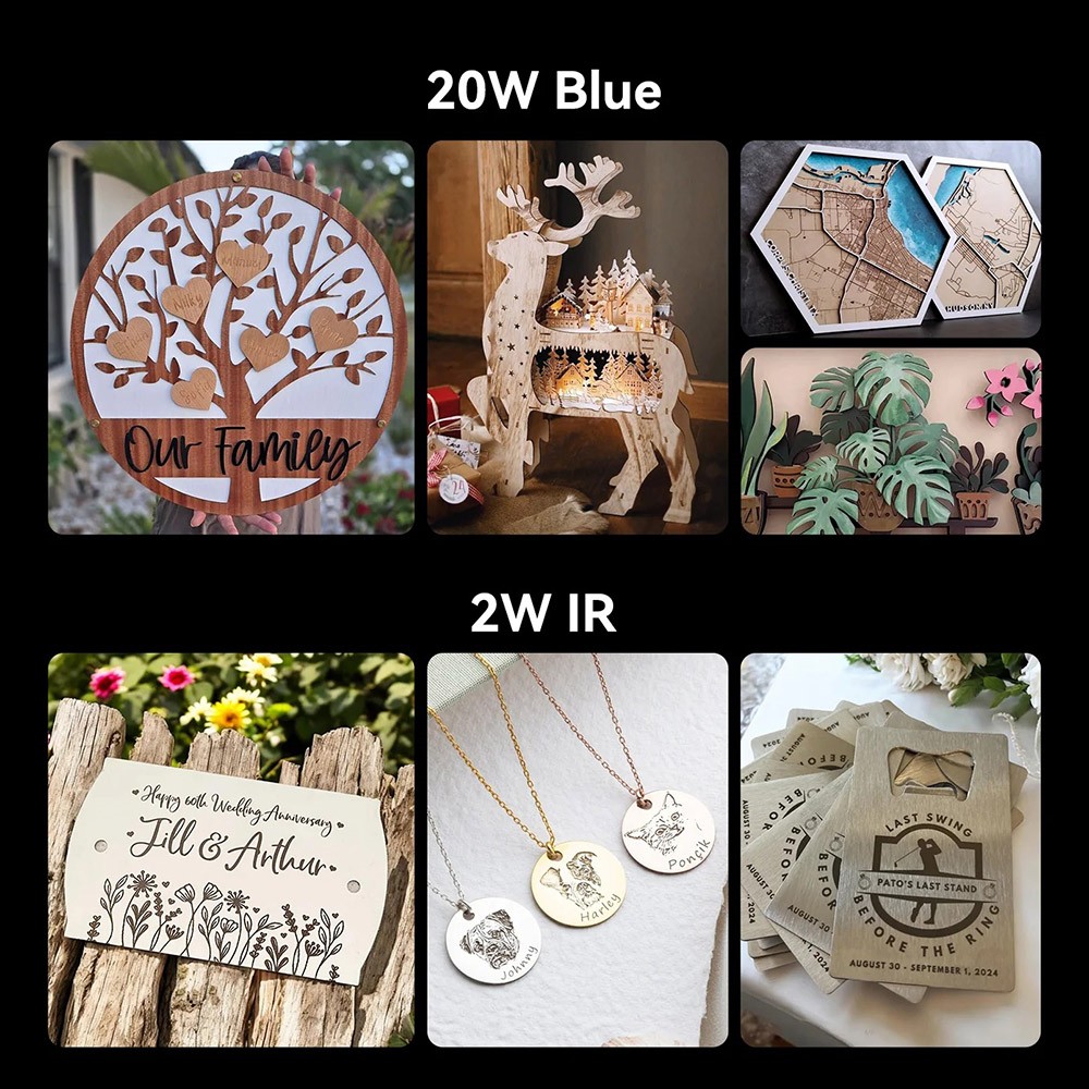 Fa, akril, bőr, textil – ez alap. De az, hogy üveg és fém gravírozás is játszik, már egy másik szint.