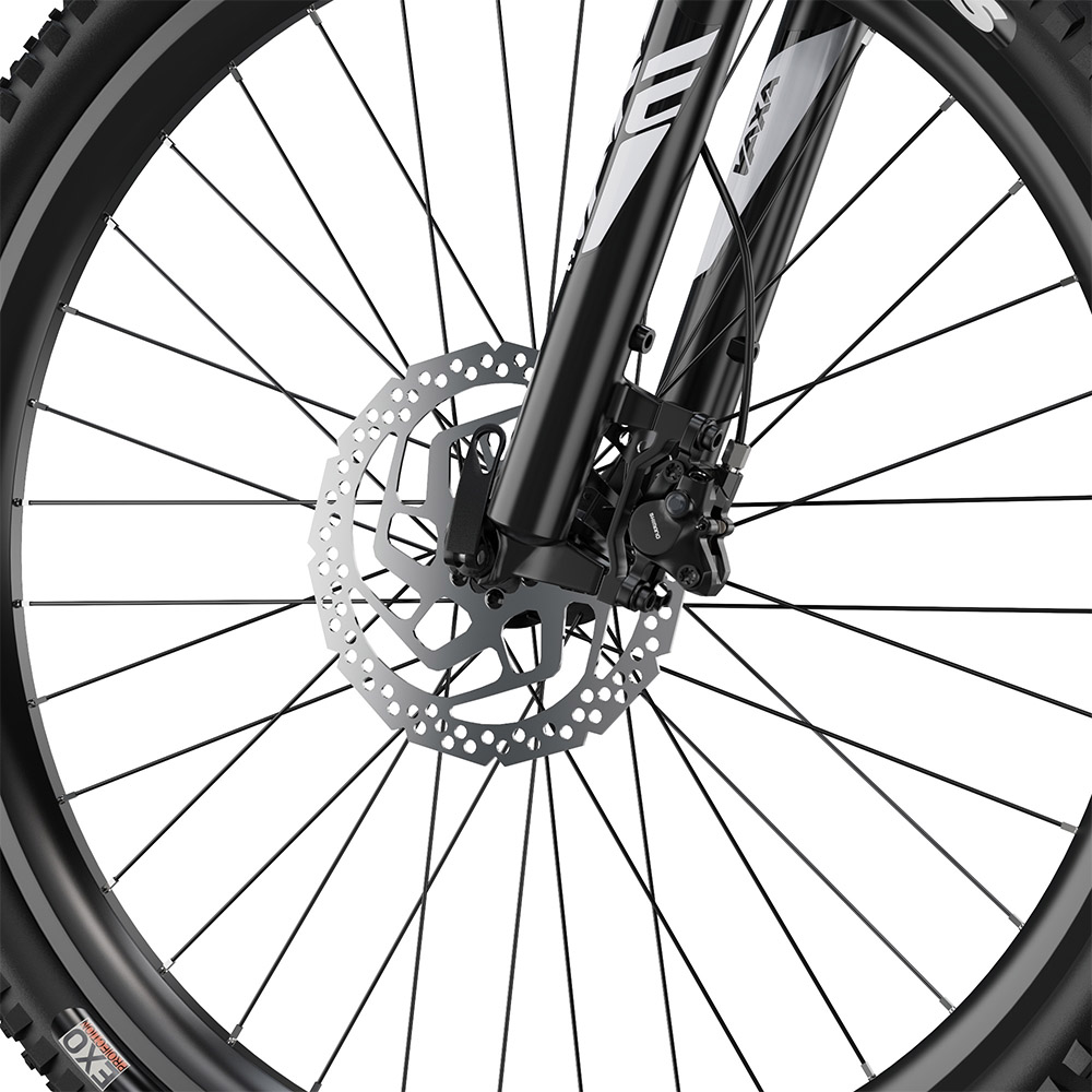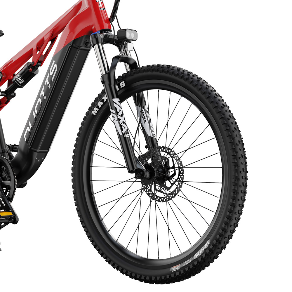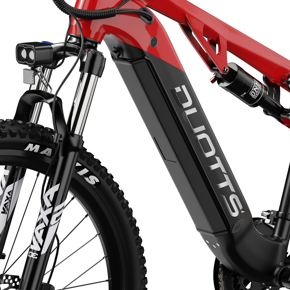 Egy komolyabb elektromos monti esetében a nyers motorikus erő mit sem ér, ha a futómű nem tudja lekövetni a terep változásait, és ezen a téren a DUOTTS E29 tervezői szerencsére nem spóroltak az alkatrészekkel. Az alumíniumötvözet váz önmagában is masszív, de ami igazán életre kelti az egész konstrukciót, az a teljes felfüggesztés, ami maradéktalanul kisimítja az utat alattad. Elöl egy 100 mm-es rugóúttal rendelkező, állítható és lockout funkciós ZOOM teleszkópvilla dolgozik, hátul pedig egy professzionális, testsúlyhoz kalibrálható DNM légrugós lengéscsillapító nyeli el a fizikai sebzést, mielőtt az a gerincedet érné. Amikor egy durvább, köves-gyökeres szakaszon rongyoltam végig, szinte vártam a megszokott, fogcsikorgató rázkódást, de a 27.5 hüvelykes, 2.6 széles Maxxis gumiabroncsokkal kombinálva az egész bicikli úgy siklott át az akadályokon, mint egy frissen optimalizált szoftver a legújabb PC hardveren. Semmi frame drop, semmi megakadás, csak folyamatos, magabiztos haladás. És ha már magabiztosságról beszélünk: a közel huszonhét kilós önsúlyt és a felgyorsult, tehetetlen tömeget valaminek meg is kell állítania vészhelyzetben. Erre a feladatra a legendásan megbízható, kétdugattyús Shimano MT200 hidraulikus tárcsafékeket vetették be 180 milliméteres tárcsákkal, amik olyan harapósak és olyan finoman adagolhatók, hogy még a legmeredekebb, saras lejtőkön sem érzed azt egyetlen pillanatig sem, hogy elvesztetted volna a kontrollt a jármű felett.