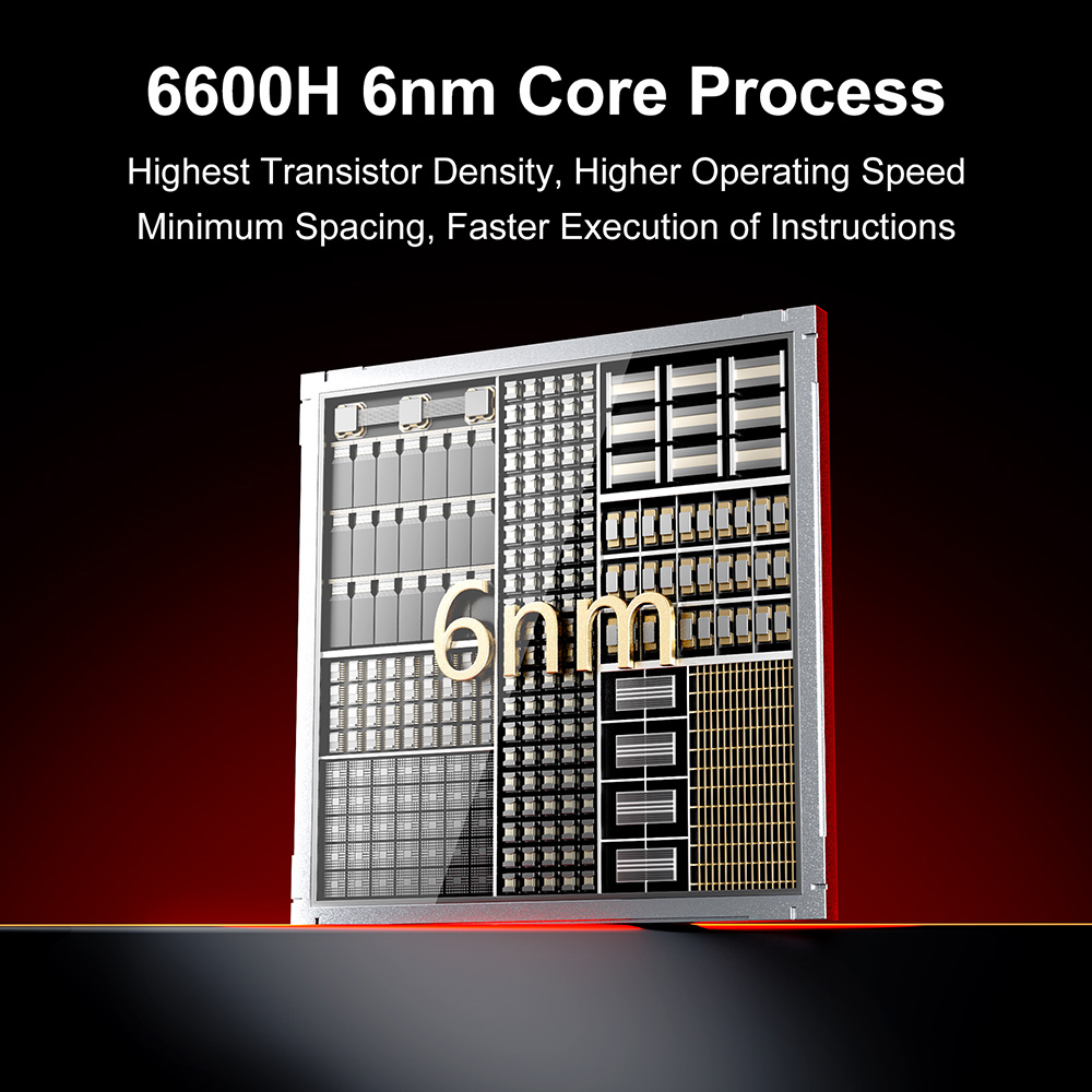 A gép lelke az AMD Ryzen 5 6600H, vagyis egy 6 magos, 12 szálas, akár 4,5 GHz-ig skálázódó mobilprocesszor, amely a Zen 3+ architektúrára épül. Ez a papíron is az a szint, ahol már nem kell mentegetni a gépet azzal, hogy „jó, de hát ilyen kicsi”. Nem. Ez egyszerűen egy erős, modern, rendesen használható processzor, amely irodai munkára, multitaskingra, böngészős túltolásra, tartalomfogyasztásra, könnyebb kreatív feladatokra és némi játékra is simán vállalható alapot ad.