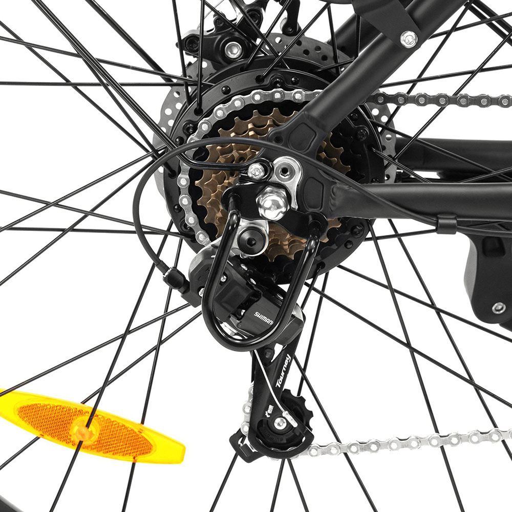 A Shimano 7 sebességes hátsó váltórendszer ebben a kategóriában nem valami egzotikus extrafegyver, de pontosan az a fajta ismerős, könnyen élhető technika, amit szeretek. Nem akar többet mutatni annál, ami, viszont jól együtt dolgozik a motorral, és ez a lényeg. Egy ilyen bringánál a váltó feladata nem az, hogy hegymászó rekordokat döntsön, hanem az, hogy segítsen kényelmes fordulaton tartani a tekerést városban, enyhébb emelkedőn, hosszabb sík szakaszokon vagy akkor, amikor a rásegítést finoman kombinálnám saját erővel. A Roamer 1-nél ezt teljesen rendben kaptam meg. És szerintem itt pont az a jó, hogy nincs túlbonyolítva.