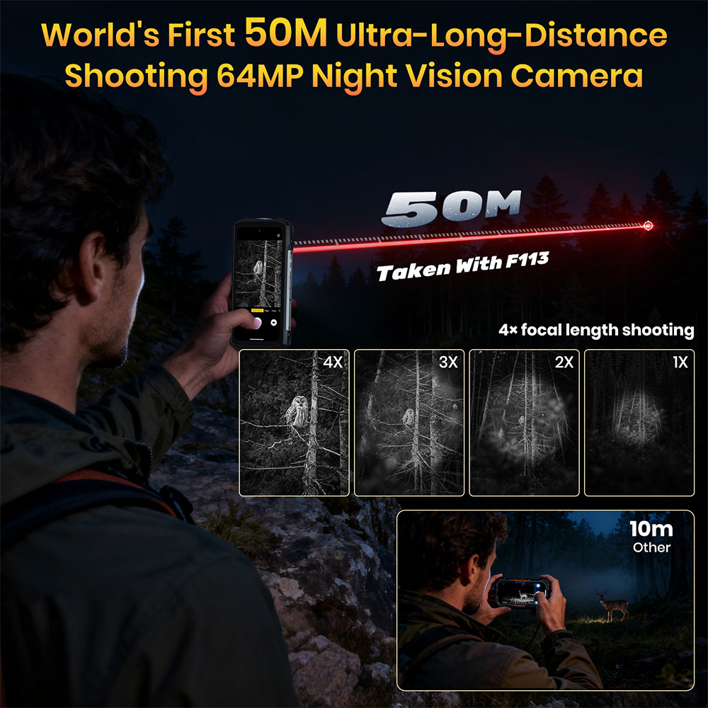 A kameraoldal az a pont, ahol a F113 elkezd kilépni a sima „nagy aksi, nagy test, nagy hang” kategóriából, és valami saját karaktert mutat. A gyártó szerint a hátlapon egy 50 MP-es Sony IMX766 főegység, egy 64 MP-es OV64B infrás éjjellátó kamera és egy 5 MP-es makró dolgozik, elöl pedig egy 32 MP-es Sony IMX616 található, a videó pedig akár 4K/30 fps-ig mehet. A Notebookcheck ezt részben megerősíti: 32 MP előlapi kamera, 50 MP hátlapi fő kamera, 5 MP makró és 64 MP-es night vision egység, amely teljes sötétségben is képes képet készíteni, mert az emberi szem számára láthatatlan infravörös fényt érzékeli akár 50 méterig. A cikk azt is megemlíti, hogy egy 3 wattos IR fényforrás segíti a jelenetek megvilágítását, ha nincs más infrás forrás a környezetben. : Na ez már érdekesebb, mint a szokásos strapatelefonos kameraszereposztás, ahol a „plusz szenzorok” gyakran csak díszletnek érződnek. Az IMX766 név önmagában ismerősen cseng azoknak, akik pár éve követik a mobilos kameravilágot, mert ez nem valami teljesen ismeretlen, alibiből bedobott szenzor. Ez persze még nem jelenti azt, hogy a F113 hirtelen fotós csúcsmodell lenne, mert a képfeldolgozás, a szoftver és az egész rendszerhangolás legalább annyira fontos, mint maga a szenzor. De a papíron látható összeállítás azt igenis sugallja, hogy itt a gyártó próbált valami komolyabban vehető alapot adni. Az igazi nagy mutatvány viszont egyértelműen a 64 MP-es, nagy hatótávú éjjellátó kamera, ami a gyártói kommunikáció szerint akár 50 méterre is ellát, a Notebookcheck pedig ugyanezt a képességet emeli ki a telefon fő különlegességeként. : Ez az a funkció, aminél egyből beindul a képzelet, és nem véletlenül. Vadmegfigyelés, táborozás, kültéri munka, biztonsági jellegű ellenőrzés, elhagyott helyek, sötét udvar, erdei ösvény – hirtelen egy csomó olyan szituáció jut eszembe, ahol ez nem gimmick, hanem tényleg hasznos tud lenni. És pont ez a jó benne: nem pusztán különleges, hanem van funkcionális értelme is, ami a modern mobilpiacon már önmagában ritka.