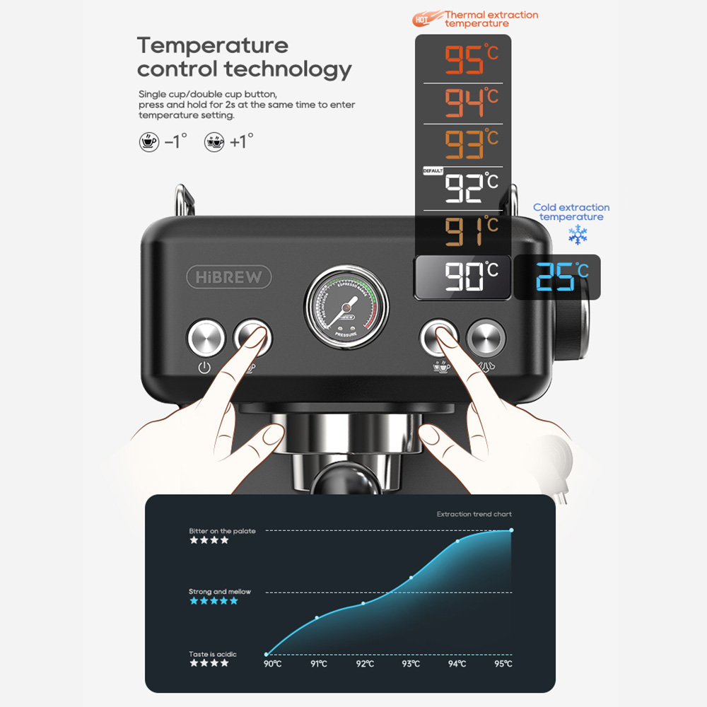 A rozsdamentes acélból kialakított, meghosszabbított fűtőcső és a termosztatikus megoldás azt szolgálja, hogy a vízhőmérséklet stabilabb maradjon. Ez kulcskérdés, mert a presszó egyik leggyorsabb gyilkosa a hektikus hőmérséklet. A H10A-nál az az érzés, hogy a gép nem kapkod, hanem próbálja tartani a kontrollt, és ez az italban is visszaköszön.
