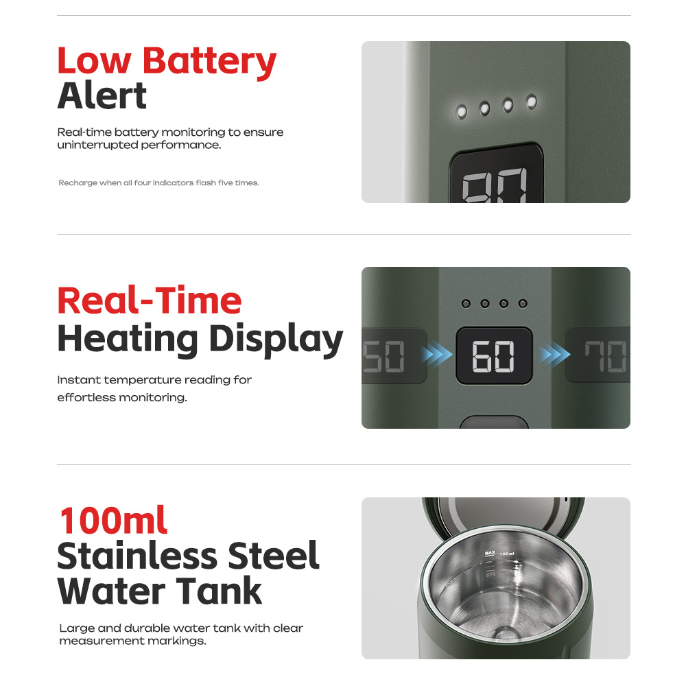 - valódi eszpresszó élmény hordozható formában, kapszula és őrölt kompatibilitás, digitális kijelző és programozhatóság, levehető akkumulátor.