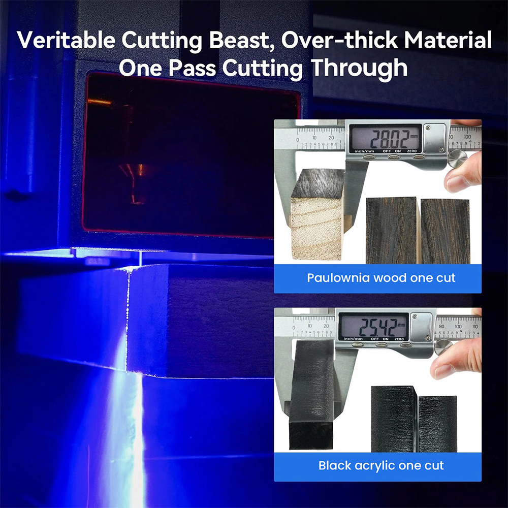 A 70W/35W dual mód itt is megvan, és ugyanazt a logikát követi, mint a nagyobb modelleknél, csak egy sokkal agilisebb csomagban. A 70W mód brutális vágásra van, a 35W pedig finom gravírozásra. Ami viszont itt különösen jól működik, az az, hogy a gép mérete miatt gyorsabban tudsz váltani projektek között. Nem kell hosszasan újrakalibrálni, nem kell újraépíteni a setupot. Ez különösen akkor jön jól, ha sokféle munkát végzel: egy kis széria vágás, aztán egyedi gravírozás, majd megint vágás. A közösségi tapasztalatok alapján ez a fajta rugalmasság az egyik legnagyobb erőssége a K1 Pro Maxnak. Olyan, mint amikor egy játékban nem kell karaktert váltanod, mert egy builddel több szerepet is le tudsz fedni.