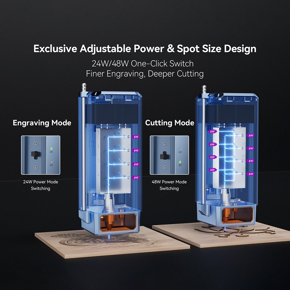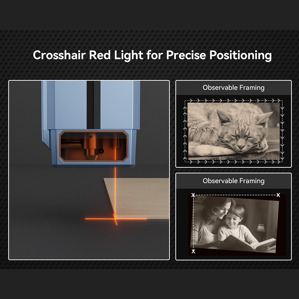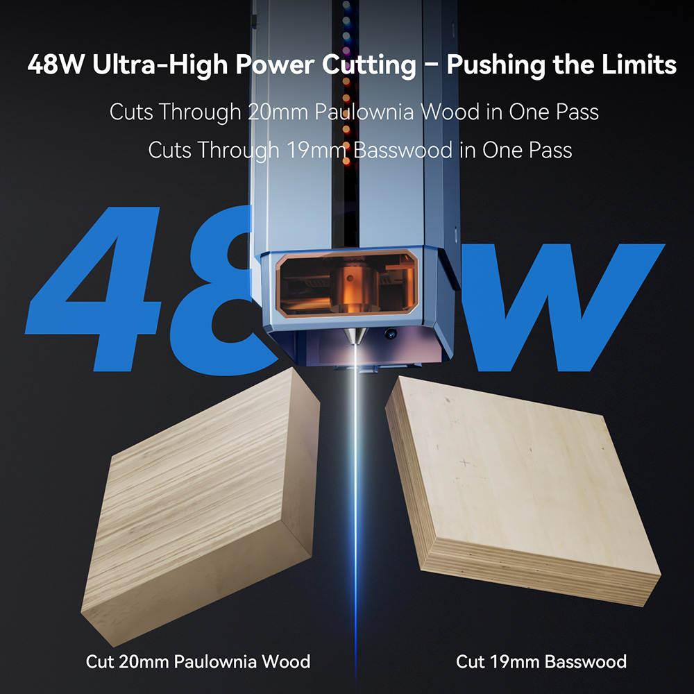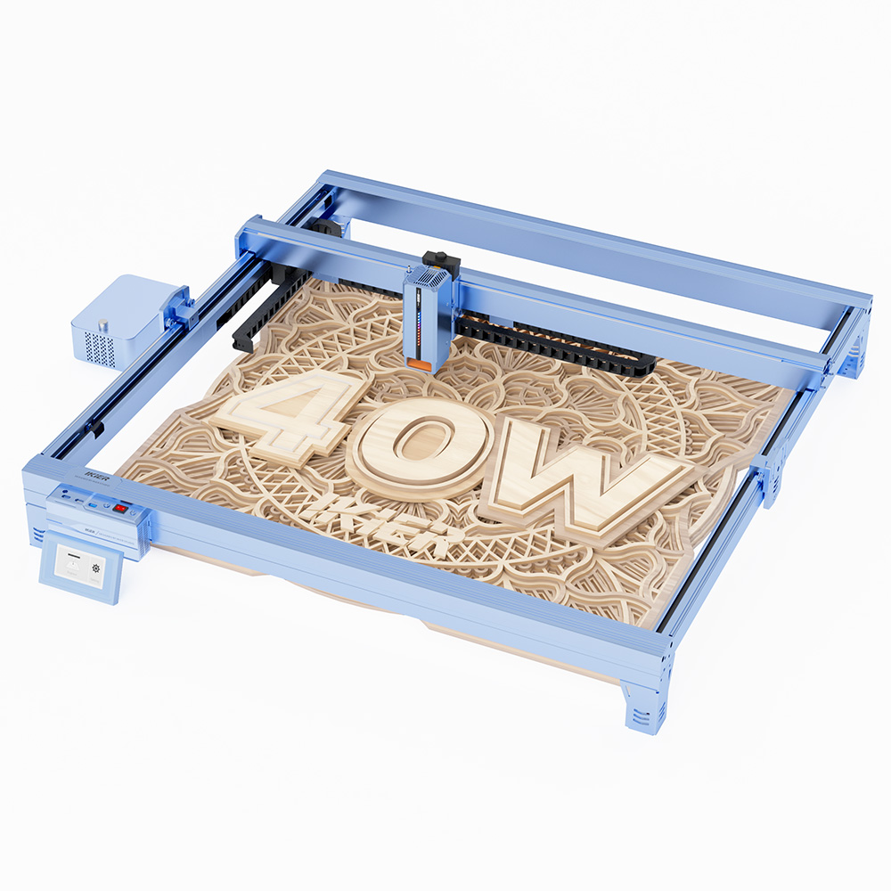 A kétlépcsős teljesítmény itt is kulcsfontosságú. A 40W-os vágási mód bőven elég komolyabb anyagokhoz – a gyakorlatban simán viszi a vastagabb fát és akrilt, bár nem olyan brutális tempóval, mint a nagyobb testvérek. A 20W-os gravírozási mód viszont meglepően finom. A 0,08 × 0,1 mm-es pontméret olyan részletességet ad, ami sok felhasználót meglep: vékony betűk, finom minták, részletes grafikák – nem égnek szét, nem mosódnak el. Ez a kettősség adja a gép igazi karakterét: nem csak vágni tud, hanem szépen dolgozni is.