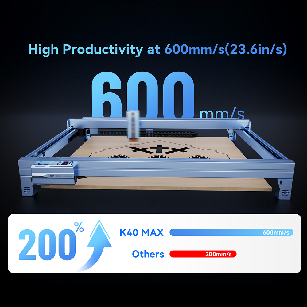 Papíron a 600 mm/s nem hangzik annyira extrémnek, de a valóságban ez pont az a tartomány, ahol a sebesség még nem megy a minőség rovására. A visszajelzések szerint a K40 MAX stabil, nem rezonál, nem „táncol” nagy sebességnél sem. Ez különösen fontos nagy felületeknél, ahol egy apró pontatlanság is látványos hibává nőhet. Itt viszont a mozgás egyenletes, kiszámítható, ami hosszú távon sokkal többet ér, mint a papíron gyorsabb, de instabil rendszerek.