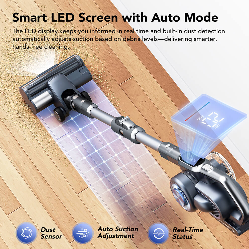 Kifejezetten szeretem, amikor egy porszívó nem úgy kommunikál velem, mint egy néma háztartási tárgy, amitől aztán találgathatom, hogy éppen mire készül. A H11 Pro LED kijelzője mutatja a hátralévő időt, az aktuális módot, a por szintjét és az esetleges hibakódokat, ami napi használatban meglepően nagy komfortot tud adni.