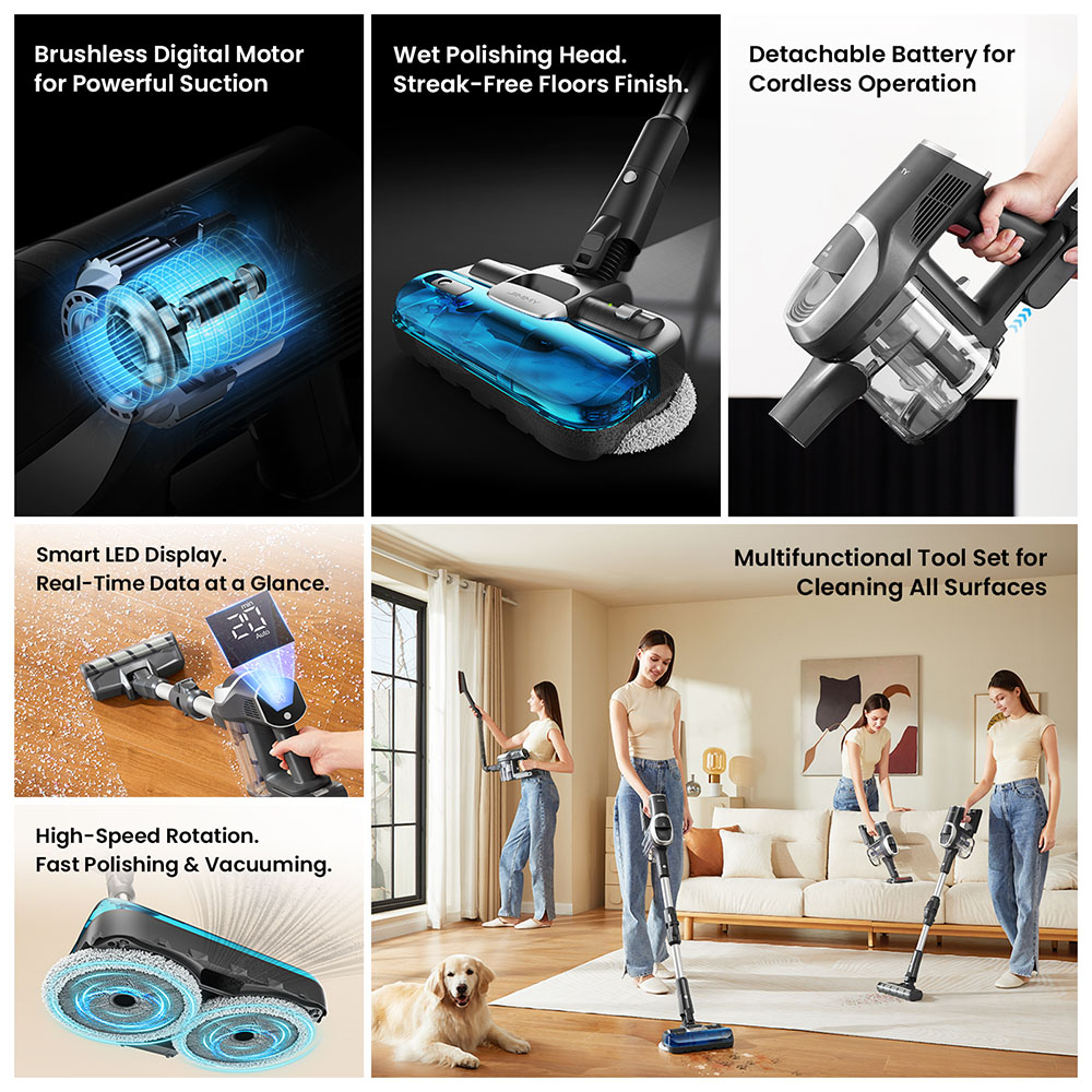 - A szívóerő valóban meggyőző, főleg keménypadlón és állatszőrnél. Az Aqua polírozófej nem dísznek van, hanem tényleg hozzáad a napi takarításhoz. A hajlítható padlófej kifejezetten hasznos, és a tartozékcsomag meglepően sok valós helyzetre ad használható megoldást. Az üzemidő reálisan is jó, a kivehető akku praktikus, a LED kijelző és az állványos töltés pedig kényelmesebbé teszi az együttélést a géppel.