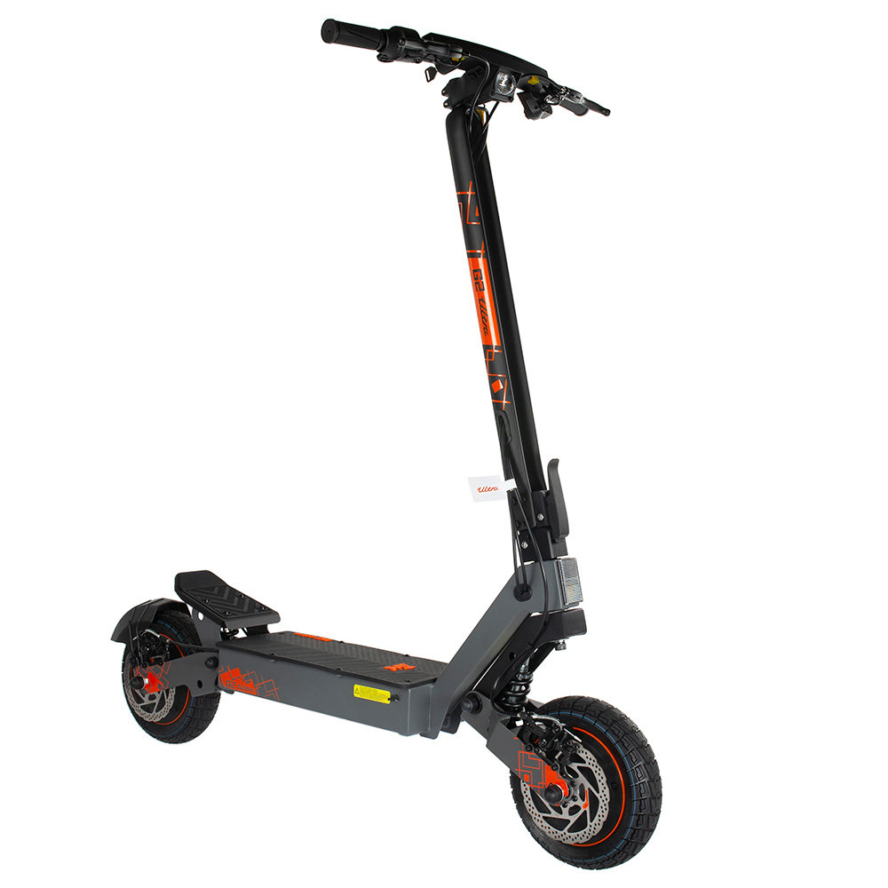 Az első és hátsó tárcsafék, valamint az e-fék kombinációja kötelező minimum egy ilyen gépnél, és jó látni, hogy a G2 Ultra ezt meg is kapja. A gyártó 6-12 méteres fékutat ír, ami persze körülményfüggő, de a tárcsafékek mérete és a hangsúlyosabb fékrendszer legalább azt jelzi, hogy a KuKirin nem csak a gyorsulásra figyelt.