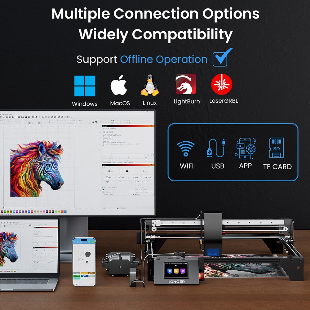 LightBurn kompatibilitás, több platform támogatás (Windows, macOS, Linux) – ez az a szint, ahol már nem a gép határozza meg a workflow-t.