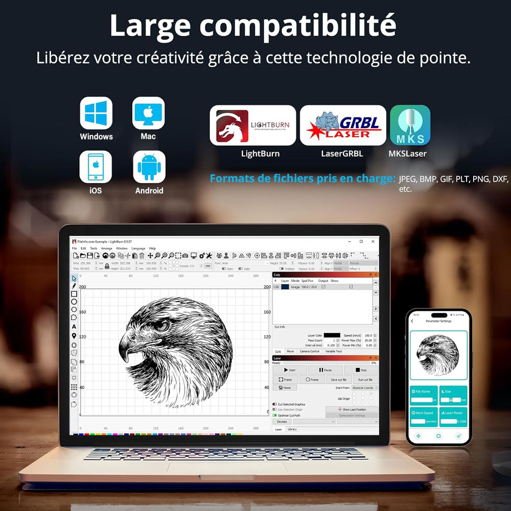 A LaserGRBL és a LightBurn támogatása szerintem szinte kötelező minimum, és jó látni, hogy az X3 Pro ezt rendesen hozza. A támogatott fájlformátumok köre is széles, így nem kell minden második ötletnél azon gondolkodni, hogy most ezt vajon be tudja-e nyelni a rendszer.
