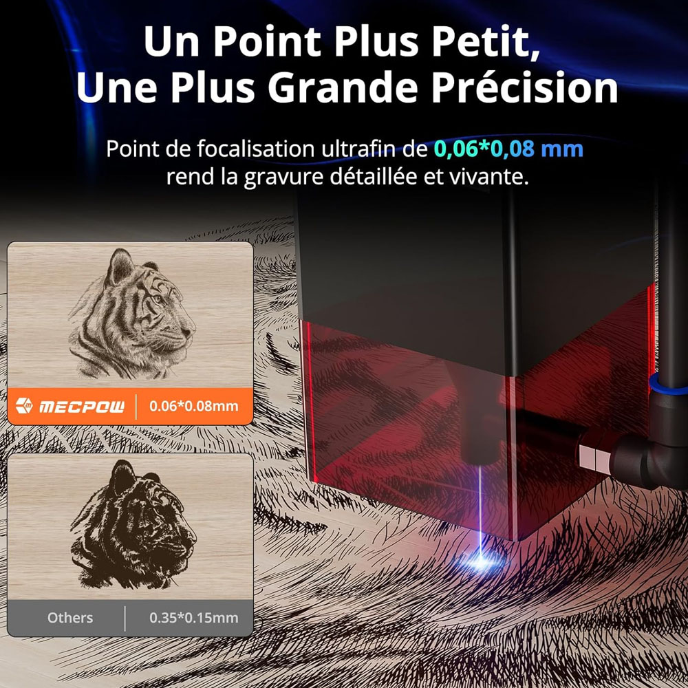 A lézerpont mérete 0,08 × 0,1 mm, ami elég finom ahhoz, hogy a gravírozás ne tűnjön darabosnak vagy bumfordinak. Ez fontos, mert sok erősebb gépnél előjön az a furcsa kompromisszum, hogy vágni nagyon tudnak, de a részletesség már kevésbé elegáns. Itt szerencsére az az érzésem, hogy a Mecpow próbált középen megállni: legyen benne kraft, de ne veszítsük el a finomabb vonalak szépségét sem.