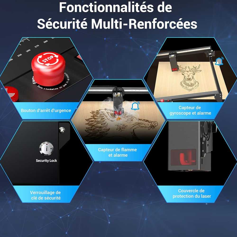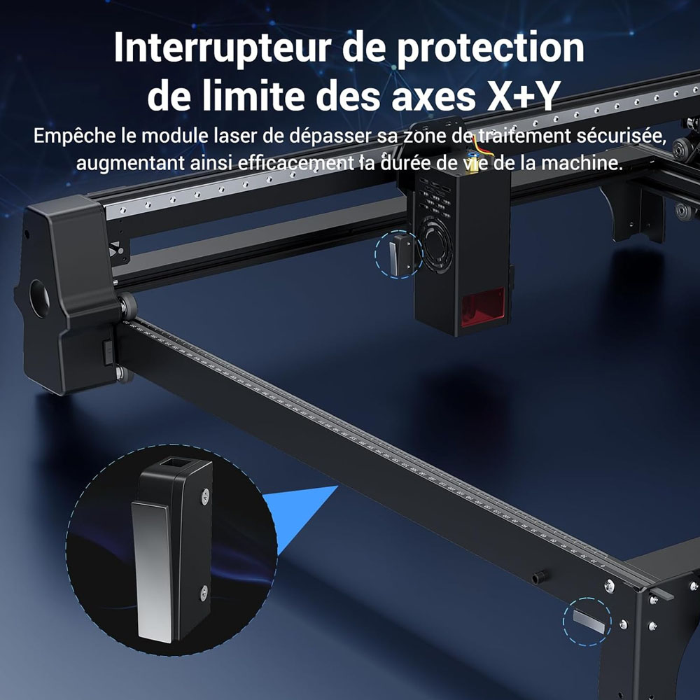 A Mecpow szerencsére nem vette félvállról a biztonsági oldalt. Az X5 Pro kapott biztonsági zárat, vészleállítót, lángérzékelőt, dőlésriasztást, végálláskapcsolókat és szemvédővel ellátott lézerfejet. Ez együtt már egy olyan csomag, amit jó látni egy ekkora teljesítményű nyitott rendszernél.