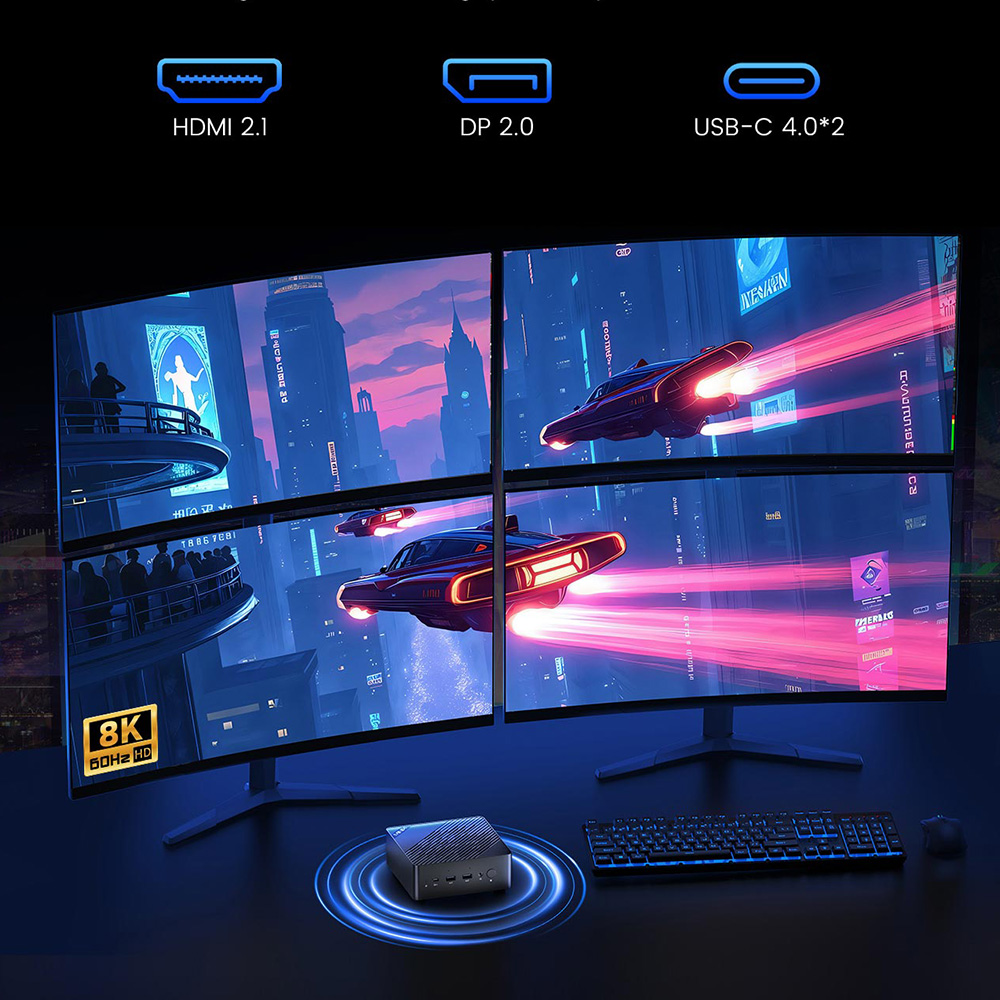 Ez az a pont, ahol a mini PC kilép az otthoni gép szerepből, és simán befér egy komolyabb workstation vagy akár egy trading setup alá is. Több monitor, több workspace, több fókusz – ha egyszer megszokod, nehéz visszalépni.
