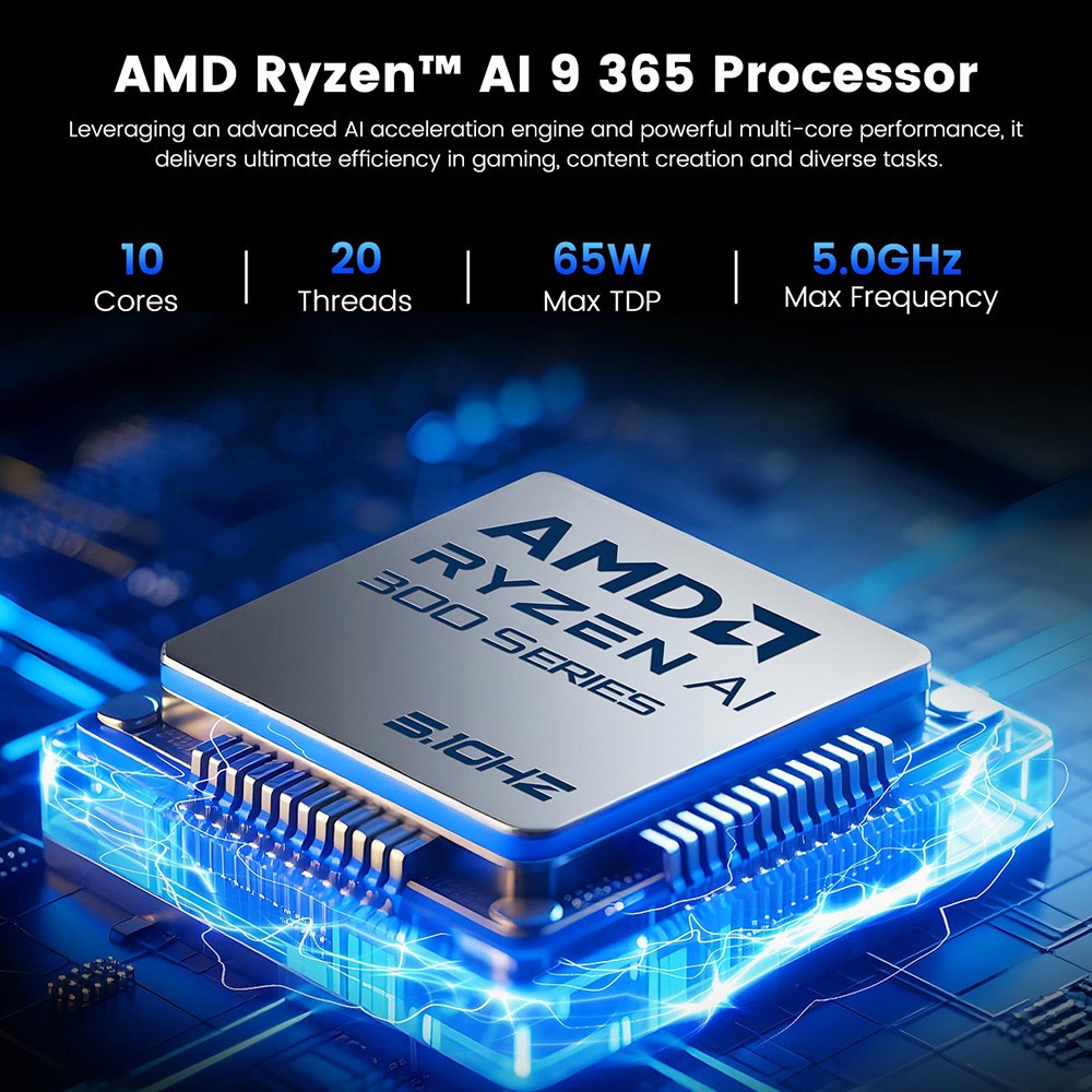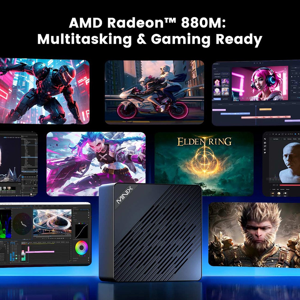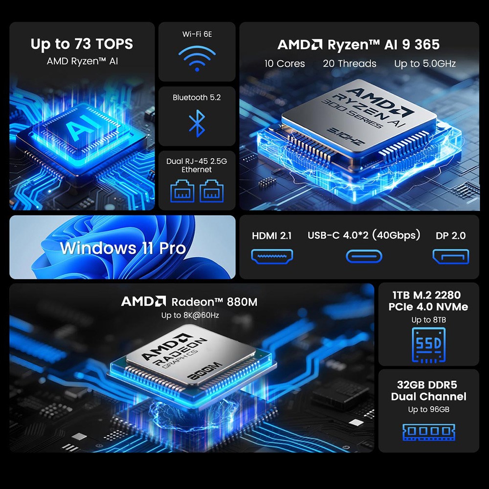 - brutális Ryzen AI 9 teljesítmény, dedikált AI NPU, erős Radeon 880M grafika, négy kijelzős támogatás, bővíthető RAM és tárhely, dupla 2.5G LAN, modern csatlakozók.