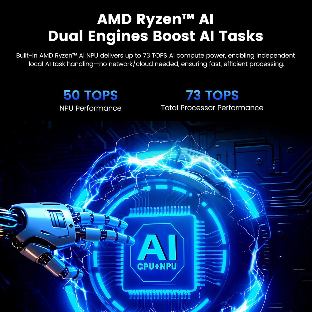 A középpontban az AMD Ryzen AI 9 365 áll, ami 10 maggal és 20 szállal, akár 5 GHz-es boost órajellel dolgozik. Ez önmagában is komoly teljesítmény, de itt jön be az, ami miatt ez a gép kilóg a sorból: a dedikált AI NPU, ami 50 TOPS teljesítményt hoz, a teljes rendszer pedig 73 TOPS körül mozog.