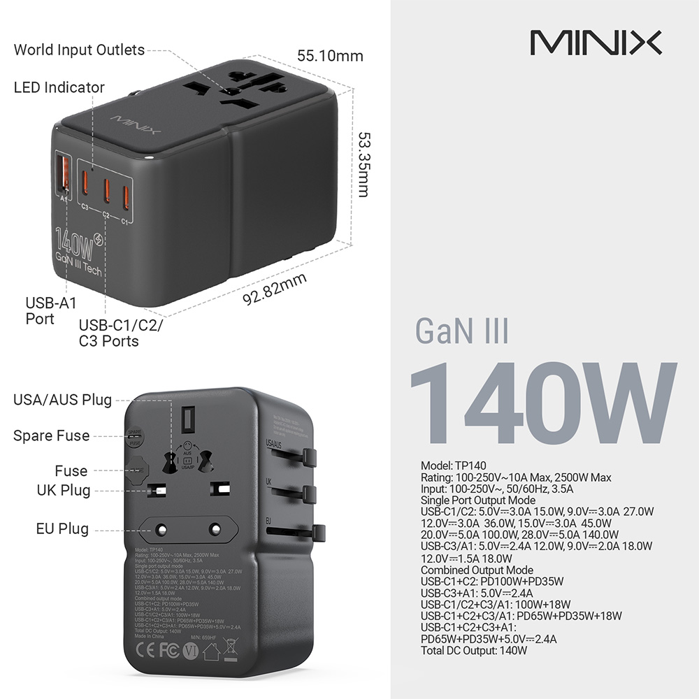A MINIX TP85 egyik klasszikus utazóadapteres selling pointja, hogy USA, EU, UK és AU plugrendszereket támogat, ezzel papíron több mint 180 országot lefedve. Ez szép marketingmondat, és alapvetően még igaz is, csak a gyakorlatban ezt nem úgy kell olvasni, hogy a világ minden konnektora boldog mosollyal várja a TP85-öt. Az ilyen számok mindig a leggyakoribb plugtípusokra épülnek, és a gyártó maga is megjegyzi, hogy bizonyos országok, például India és Dél-Afrika kivételt jelenthetnek. Szerintem ez egyébként teljesen korrekt. Jobb, mint amikor a doboz azt hazudja, hogy innentől univerzális állampolgára lettél az elektromos világnak, aztán ott állsz valami teljesen más aljzattal szemben, mint egy eltévedt hátizsákos civilizációkutató.