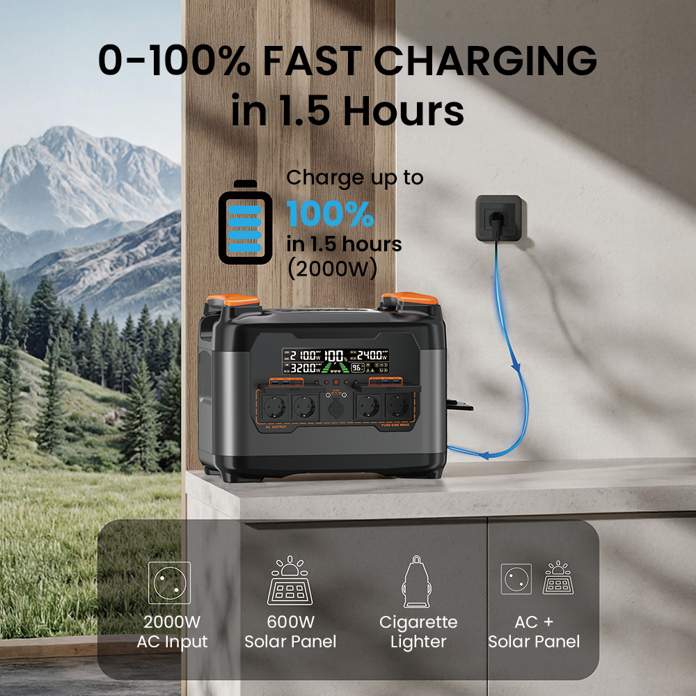 A NECESPOW S2400 töltési oldala kifejezetten erősnek hangzik. A 2000 W-os AC gyorstöltés, illetve a 2300 W-os AC + napelemes hibrid töltés már papíron is nagyon meggyőző. A gyártó szerint a rendszer 1,2–1,5 óra alatt teljesen feltölthető, ami ebben a kapacitásosztályban kimondottan durva tempó.
