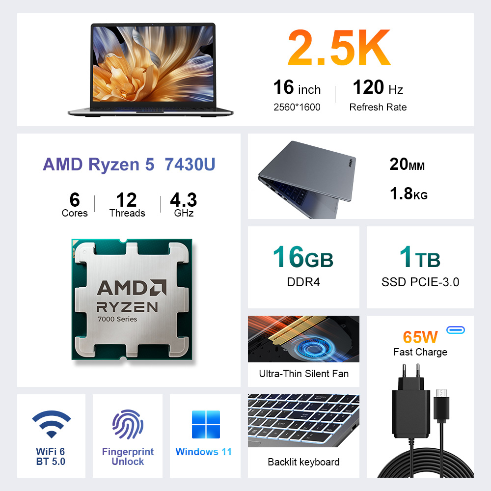 - A 16 hüvelykes, 2560x1600-as, 120 Hz-es kijelző a laptop egyik legerősebb fegyvere, a Ryzen 5 7430U és a 16 GB RAM mindennapi használatra bőven elég, az 1 TB SSD kényelmes és nem spórolós alap, a portkínálat kifejezetten bőséges és praktikus, az ujjlenyomat-olvasó és a háttérvilágítású billentyűzet valódi használati plusz, a 16:10-es képarány és a nagy színterű panel munkára és multimédiára is nagyon jó.