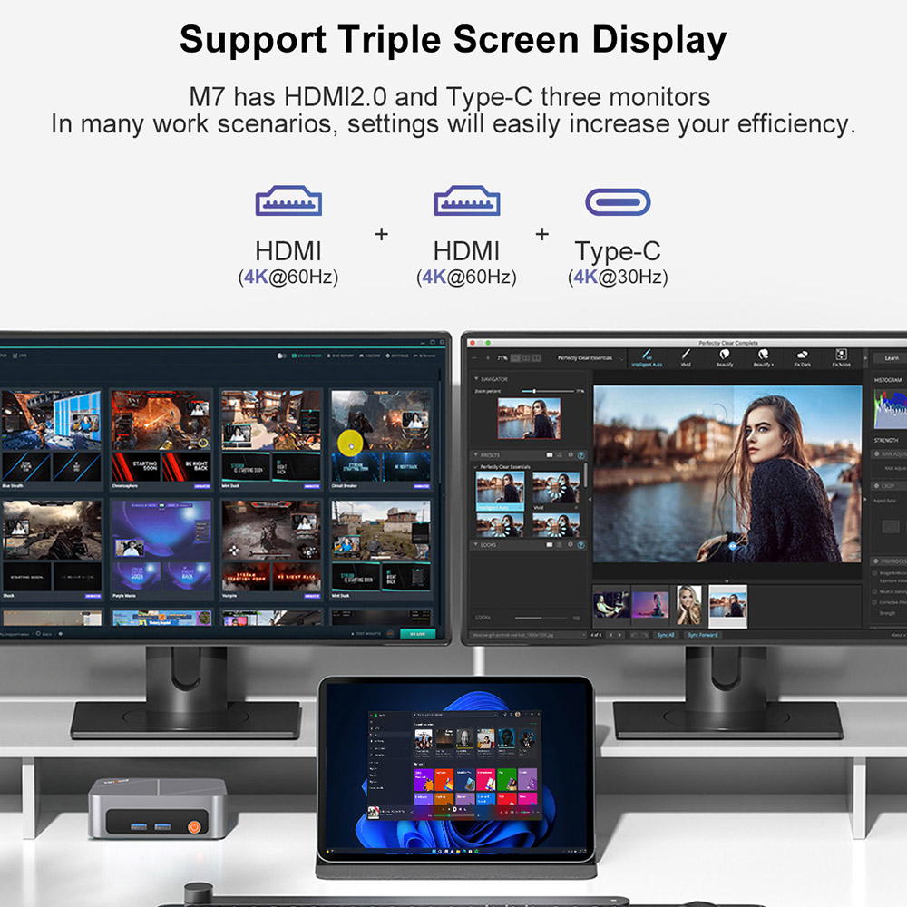 A mini PC-k esetében mindig kényes pont, hogy a gyártók mennyire próbálják gamer irányba tolni a narratívát. A Ninkear M7-nél is érződik némi túlzás a marketingben, amikor „kiváló minőségű játékélményt” emlegetnek, mert ezt azért érdemes a helyén kezelni. A Ryzen 5 7430U-ba épített Radeon grafika nem arra való, hogy valaki a legújabb nagy címeket magas részletességen hajtsa rajta, és a független tesztek sem ezt állítják. A Notebookcheck egyértelműen egyszerűbb irodai és multimédiás gépként pozicionálja, a hazai teszt pedig kifejezetten kiemeli, hogy játékra nem érdemes túl sokat belelátni, miközben általános használatra, netezésre, videózásra és többmonitoros munkára bőven elég. Nekem pont ez a józanság tetszett meg benne. A két HDMI és az egy teljes funkcionalitású Type-C csatlakozó együtt tényleg lehetővé teszi a háromkijelzős felállást, és ez nem valami felesleges webshopos dicsekvés, hanem valós, kézzelfogható előny. Egy ilyen méretű gépnél kifejezetten jó érzés, hogy nem kell azonnal kompromisszumot kötni, ha valaki több képernyővel dolgozna. Dokumentum az egyiken, böngésző a másikon, kommunikáció vagy videó a harmadikon, és máris ott vagy, ahol ezek a mini PC-k igazán értelmet nyernek. A videólejátszás, streamelés és általános multimédiás használat közben az M7 sokkal meggyőzőbb, mint amilyennek a puszta árszintje alapján elsőre gondolnád. Nem egy nappaliba szánt médiadoboz puszta szerepkörében él, hanem egy rendes kis mindenes PC-ként, amelyik munkára és szórakozásra is működik, csak épp nem akar többet hazudni a grafikus képességeiről, mint ami benne van. A magyar tesztoldalon külön megdicsérték, hogy három monitort kezel és alig hallható, a gyártó pedig a 4K-s többkijelzős működést hangsúlyozza. Ezt használat közben is könnyű elhinni, mert az M7 karaktere nem a nyers vizuális erőfitogtatásban van, hanem abban, hogy a hétköznapi digitális környezetet nagyon kulturáltan kiszolgálja. :