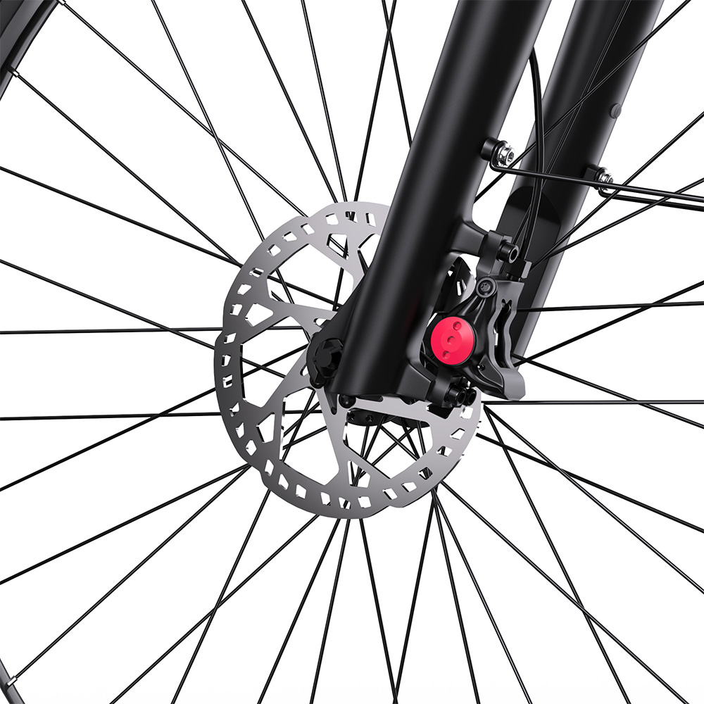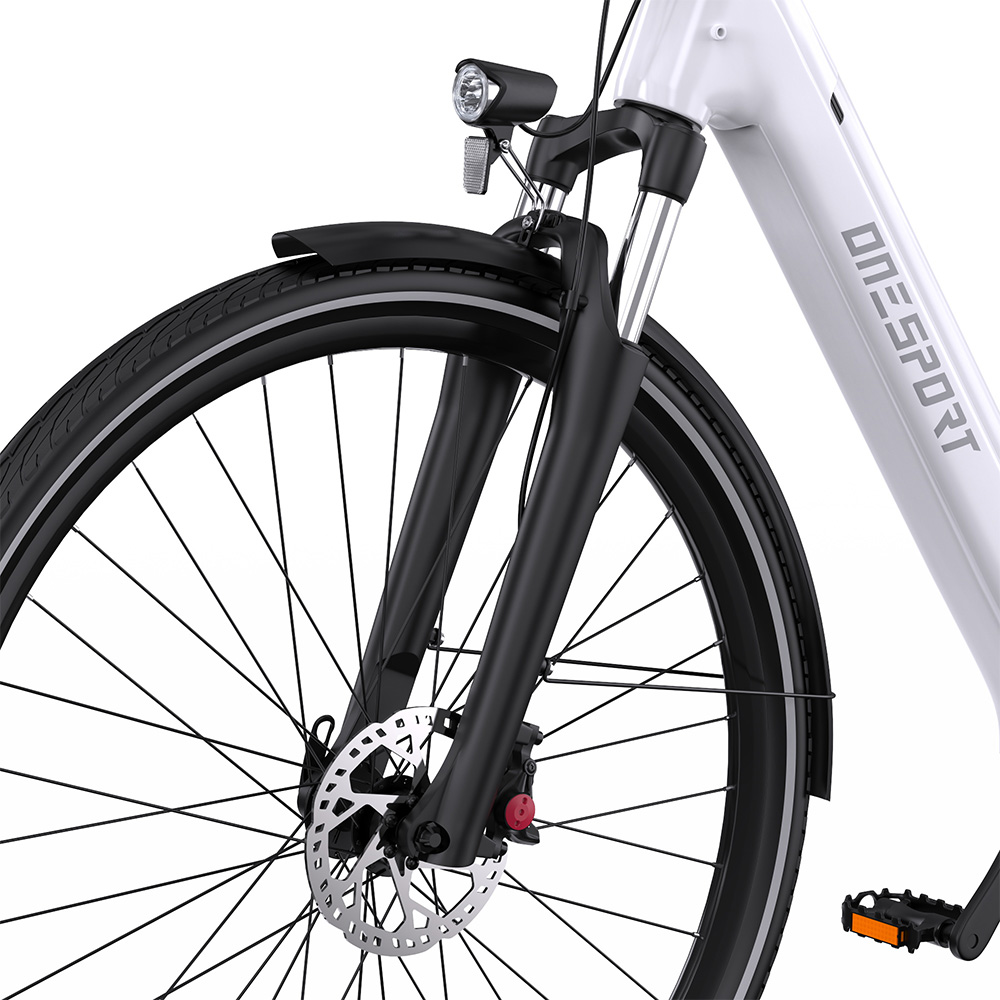 A hidraulikus tárcsafékek jelenléte az ONESPORT OT07-en nem csak adatlapra kívánkozó pipálható tétel, hanem a bringa egyik olyan pontja, ahol tényleg kijön, hogy komolyabb csomagot akartak összerakni. A hidraulikus fékeknél az a jó, hogy egy idő után már nem is külön örülsz nekik, egyszerűen csak elvárod, hogy a bringa normálisan megálljon. Aztán ha visszaülsz valami gyengébb, mechanikus, olcsóbban fogó rendszerre, hirtelen eszedbe jut, mennyire sokat jelent a kiszámítható, finomabban adagolható fékerő. Az OT07-nél pontosan ez az élmény jött elő. Nem arról van szó, hogy valami brutális, versenyszintű fékrendszert kapsz, hanem arról, hogy a kerékpár megállítása nem kérdés, nem tárgyalás, nem „na majd most meghúzom jobban”. Hanem természetes része a használatnak. Ez különösen fontos egy középmotoros, nyomatékszenzoros bringánál, mert a rendszer eleve élénkebben reagál a pedálmunkára, mint egy butább, egyszerűbb rásegítésű modell. Ha a gyorsulás kellemesen természetes, akkor a lassításnak is ugyanilyen magától értetődőnek kell lennie. Az OT07-nél ez megvan. És számomra ez a fajta egyensúly a motor és a fék között legalább olyan fontos, mint önmagában a motor ereje. Ráadásul a világítás is alapból jár hozzá, első és hátsó lámpával, ami nyilván ma már nem valami futurisztikus extra, de még mindig jó látni, ha egy bringa nem félkészen érkezik. Városi ingázásnál vagy késő délutáni hazaútnál ez nem egy apró kényelmi kérdés, hanem a használhatóság része. Az OT07 egészében véve azt az érzést adja, hogy nem csak menni akar, hanem felelősen meg is akar állni, és ez valamiért még mindig ritkább, mint kellene.