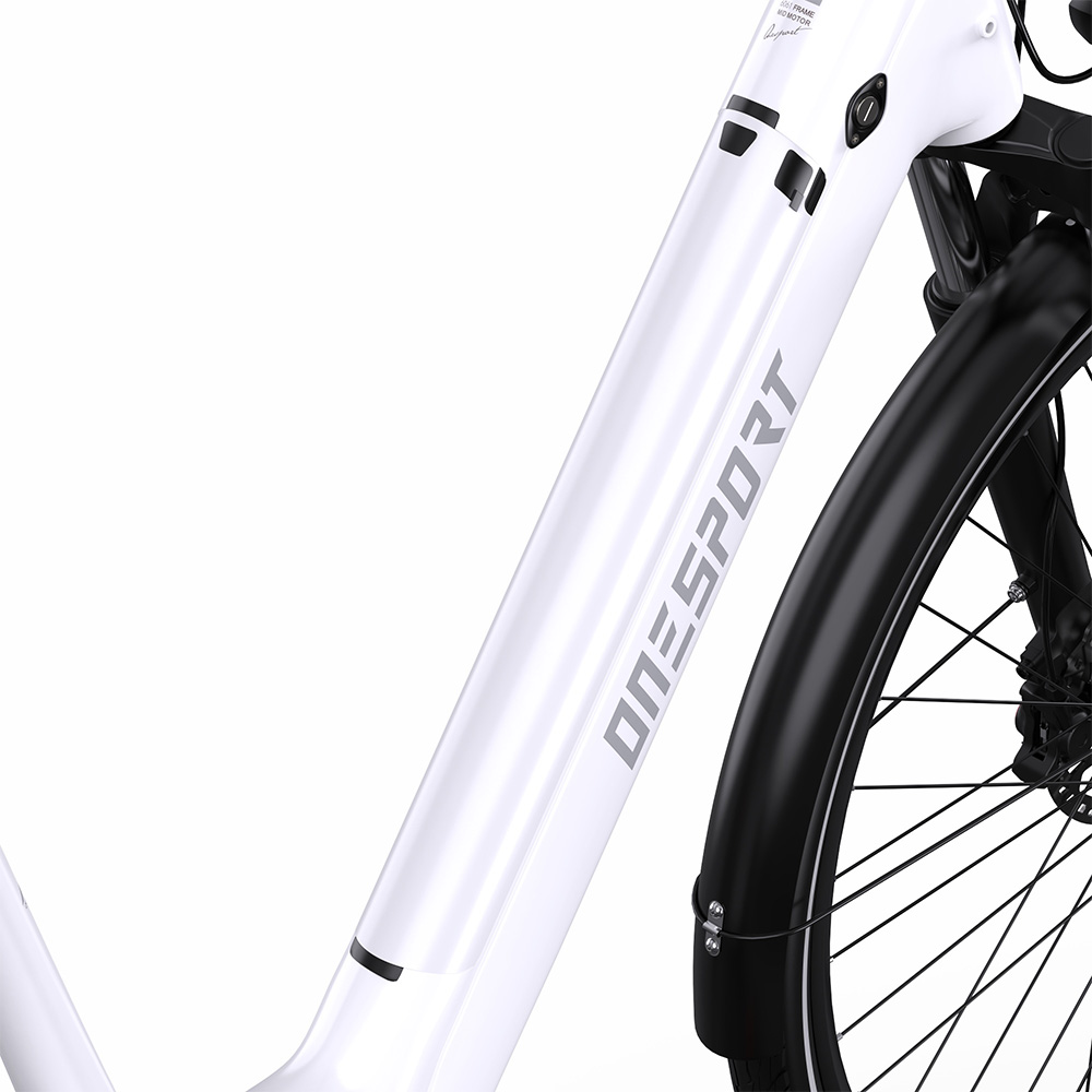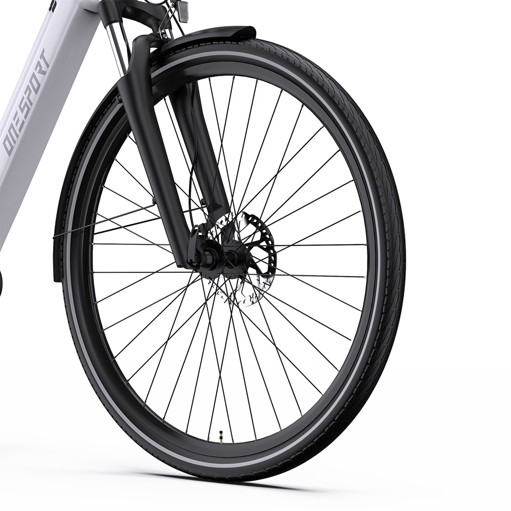 Az ONESPORT OT07 kapcsán az egyik legjobb döntés szerintem az, hogy nem próbál túl okos lenni a komfort terén. Nem akar mountain bike-nak látszani, nem akarja elhitetni, hogy terepre született, mégis ad annyi rugalmasságot és tompítást, hogy a városi és elővárosi valóság ne váljon büntetőpályává. Az alumínium lengéscsillapítós villa és a 700×45C, vagyis nagyjából 27,5 × 1,77 hüvelykes gumik együtt nagyon jól eltalált kombinációt adnak. A mai utak állapota mellett ez nem valami kényelmi luxus, hanem a mentális egészség része. A kerékpárutak jelentős része nem hibátlan, a városi aszfalt tele van varrással, repedéssel, váratlan egyenetlenséggel, és ilyenkor nagyon gyorsan kiderül, hogy egy bringa csak szép-e, vagy valóban használható is. Az OT07 számomra itt mutatta meg, hogy mennyire pontosan belőtt gép. Nem puhítja el túlságosan a vezetést, nem válik billegő, túlkompenzált komfortszörnnyé, de pont annyit levesz az út éléből, hogy ne a csuklóddal, válladdal és derekaddal fizesd meg minden rövidebb út árát. A külső tesztek is kifejezetten azt emelik ki, hogy a bringa városi és túrás jellegű használatra is kellemes, és teljesen egyetértek ezzel. Nem sportosan feszes, inkább nyugodt és stabil. A 24 kilós tömeg sem pehelysúly, ezt jobb nem romantizálni, de közben ebben a kategóriában teljesen vállalható, sőt egy középmotoros, rendes akkumulátoros, hidraulikus fékes bringánál kifejezetten civilizált. Ez a tömeg menet közben nem nyűgként jelenik meg, hanem inkább egy stabil, felnőtt bringa nyugalmát adja. Nem kapkod, nem ideges, nem akar állandóan bizonyítani. Inkább csak szépen halad. A hosszabb kormányzás, a kerékméret, a villa és az egész geometriája együtt egy olyan karaktert adnak, ami szerintem sokkal jobban passzol a valós használathoz, mint az agresszívabb, menőbbnek szánt, de idegesebb e-bike-ok világa. Az OT07-tel nem az az érzésed, hogy „meg kell ülni”, hanem hogy jól alád dolgozik. És ez bringánál óriási különbség.