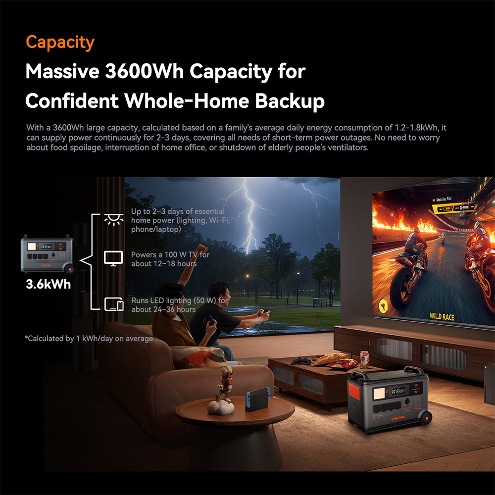 - Döbbenetes, 3600 Wh kapacitás és stabil 3600W kimeneti teljesítmény, ami a háztartási gépek óriási többségét röhögve, erőlködés nélkül elviszi a hátán.