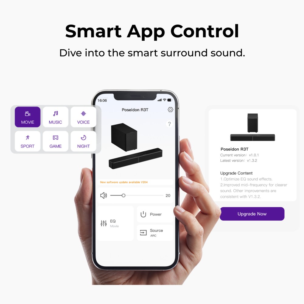 Ahogy a modern szórakoztatóelektronikai hardvereknél lenni szokott, a nyers fizikai vas megléte csak az egyenlet egyik fele, a mérleg másik serpenyőjében a szoftveres integráció és a mindennapi csatlakoztathatóság határozza meg a tartós kényelmet. Az ULTIMEA ezen a fronton egy meglepően stabil és fluid okostelefonos alkalmazással támogatja meg a rendszert, ami végleg nyugdíjazhatja a fiók mélyére az idegesítően pici, olcsó műanyag távirányítókat. Az applikációban egy tízsávos, teljesen szabadon paraméterezhető hangszínszabályzó fogad, de ha nem akarsz játékidőből perceket rabolva a frekvenciagörbékkel zsonglőrködni, a készítők beleraktak egy százhuszonegy darabos előre beállított EQ-mátrixot is. Bár ez a szám leírva elsőre indokolatlanul soknak, már-már komikus túlzásnak hathat, a szinte sebészi finomhangolási lehetőségek valójában nagyon is hálásak tudnak lenni, amikor elektronikus zenék, kompetitív shooterek, podcastek vagy éppen sötét atmoszférájú drámák között váltogatsz a kanapén. A csatlakozási opciók terén a hátoldalon ott mosolyog a ma már megkerülhetetlen standardnak számító HDMI ARC/eARC port, így a soundbar automatikusan kel életre és némul el a kijelződdel együtt, a hangerőt pedig felesleges extra mozdulatok nélkül, a tévé saját távirányítójával is kényelmesen tudod szabályozni. A hab a tortán az új generációs Bluetooth 6.0 technológia jelenléte, ami nagyságrendekkel fürgébb párosítást, stabilabb sávszélességet és észrevehetetlen, alacsony késleltetést biztosít; a telefonról ráeresztett Spotify listák vagy a YouTube videók hangja azonnal, idegesítő szinkroncsúszás nélkül robban be a szobába. Külön apró, de annál fontosabb figyelmesség az OTA (Over-The-Air) frissítések rendszerszintű támogatása, aminek hála a dsp algoritmusok és a hangprofilok folyamatosan finomodhatnak az idő múlásával. Összességében a Poseidon R3T nem árul zsákbamacskát: ez egy funkcionálisan kikezdhetetlen, acélosan feszes basszusokkal és okos dialógus-kiemeléssel rendelkező hangrendszer, ami okosan, kábelrengeteg nélkül teszi helyre a tévéd gyengélkedő gyári hangszóróit.