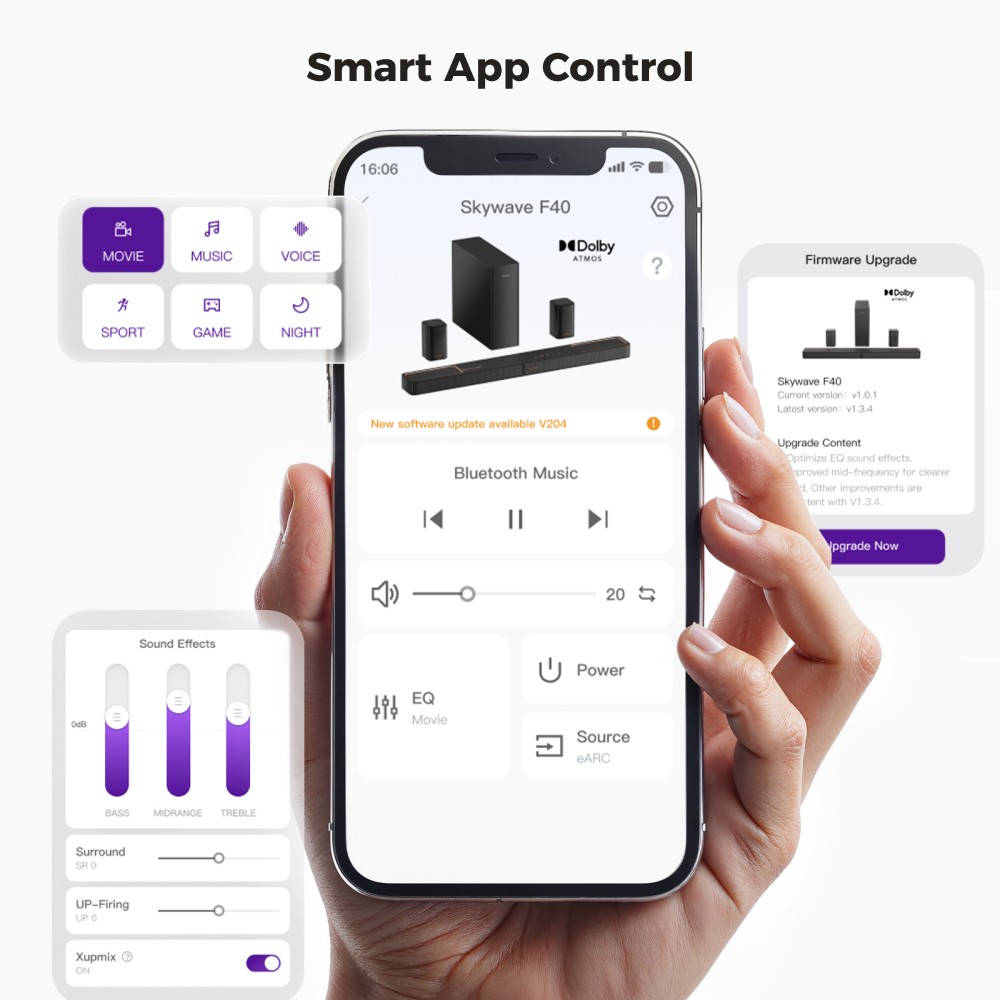 A térhatású hangzást (surround level) 13 lépésben finomhangolhatjuk -6 és +6 közötti értékeken, ami életmentő, ha a hátsó hangszórók túl közel vannak a kanapéhoz. Ezen felül kapunk egy profi 10 sávos grafikus EQ-t, és ha nem akarunk a csúszkákkal bajlódni, választhatunk elképesztő, 121 előre beállított (preset) hangkép közül! Legyen szó esti, csendes filmezésről, ahol a beszédhangok kiemelése a fontos, vagy egy pörgős e-sport közvetítésről, a rendszer pillanatok alatt alkalmazkodik. Ráadásul az alkalmazáson keresztül zökkenőmentes OTA (Over-The-Air) frissítések érkeznek, így a szoftver folyamatosan fejlődik.