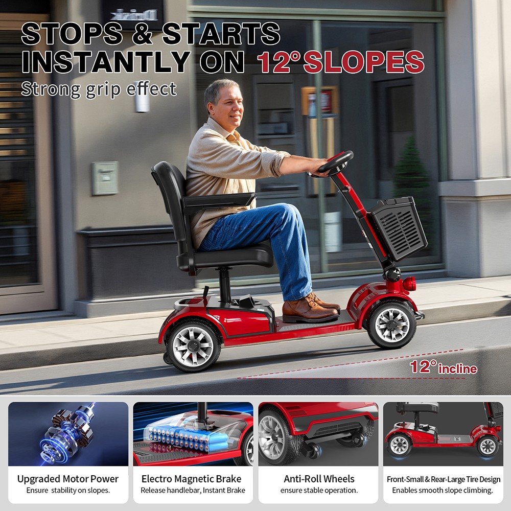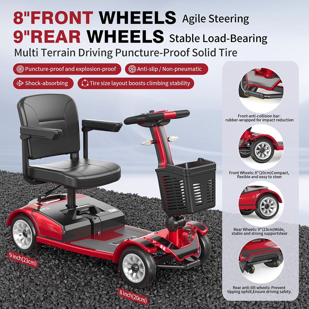 - A négykerekű felépítés tényleg stabil és megnyugtató, nem csak papíron biztonságos. A 250 wattos motor és a 7,8 km/h-s tempó pont a szerepéhez illik, nem akar feleslegesen ijesztő vagy kapkodó lenni. A mágneses fékrendszer kulturált és kiszámítható, ami ebben a kategóriában alapvető bizalmi kérdés. A tömör gumik gondtalanabb használatot adnak, kevesebb karbantartási stresszel. A nagy teherbírás és a masszív felépítés azt az érzést adják, hogy ez valódi használatra született, nem törékeny kompromisszum.