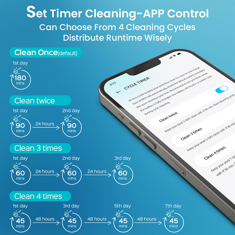 A WYBOT app nálam mindig gyanús terep, mert a háztartási gépekhez csomagolt alkalmazások jelentős része olyan, mintha valaki kötelezően legyártott volna valamit a termék mellé, aztán remélte volna, hogy a vásárló nem kérdez túl sokat. A C2 viszont ezen a ponton pozitívabb benyomást tett. Nem azért, mert valami látványos, futurisztikus élményt adna, hanem azért, mert értelmes dolgokat enged állítani. A hét tisztítási mód – Standard Full Pool, Floor Only, Wall Only, Waterline Only, Wall then Floor, Turbo Floor, Eco Floor – már önmagában mutatja, hogy a gyártó nem egyetlen mindentudó programba próbálta beszuszakolni az egész medencés valóságot. És ez jó. Egy medence ugyanis nem mindig ugyanazt kéri. Néha a padló a fő probléma, néha a vízvonal, néha egy teljes kör kell, néha meg csak karbantartó takarítás. A külső tesztekből is az jött le, hogy a C2 pont ebben erős: nem csak egyetlen karaktere van, hanem több, és ezek között tényleg van értelme váltani. A kézikönyv külön kiemeli azt is, hogy a módot még a parton kell kiválasztani, mert a Bluetooth kapcsolat víz alatt már nem használható. Ez nekem külön szimpatikus volt, mert legalább nem játszották el, hogy a fizika felett áll az app. Ehelyett normálisan leírják, hogyan működik a rendszer, és ennyi. A négy időzítési opció – 1×120, 2×60, 3×40, 4×30 perc – pedig az Eco módot teszi sokkal érdekesebbé. Nem csak az a kérdés, mennyit bír a robot, hanem az is, hogy hogyan osztja be a rendelkezésre álló energiát, és ebben a C2 kifejezetten okos partnernek tűnt. Olyan, mint amikor egy játékban végre nem csak a nyers erő számít, hanem a jó build is. Itt a build maga a takarítási stratégia.