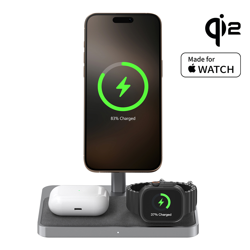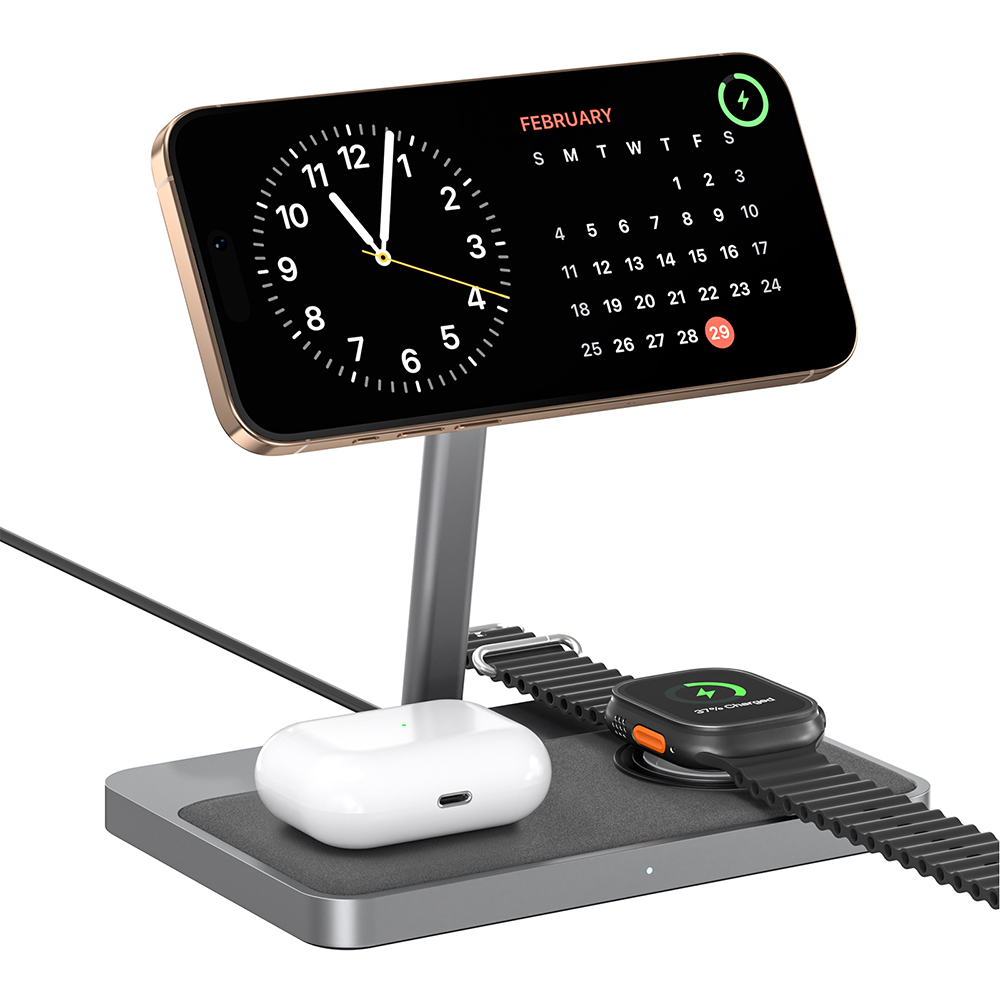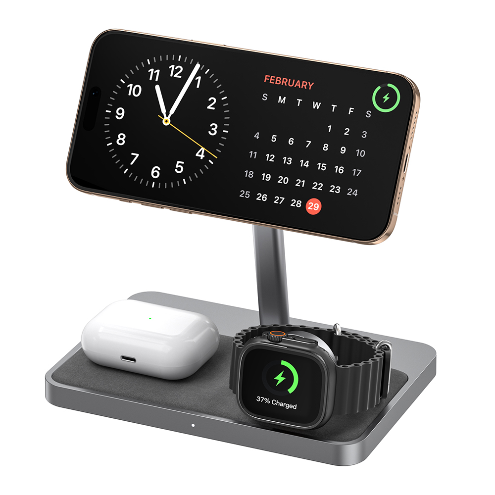 És közben ott a másik két zóna: egy az AirPodsnak, egy az Apple Watch-nak. Nincs kábelkeresgélés, nincs dugdosás. Mindennek megvan a helye.